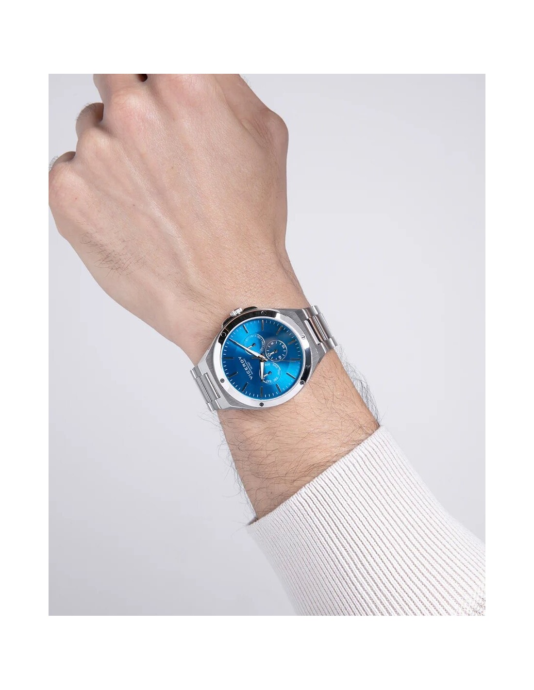 La caja del reloj tiene un diámetro de 42mm. Esfera color azul. Cristal mineral y movimiento de cuarzo multifunción. Pulsera de acero con broche desplegable.