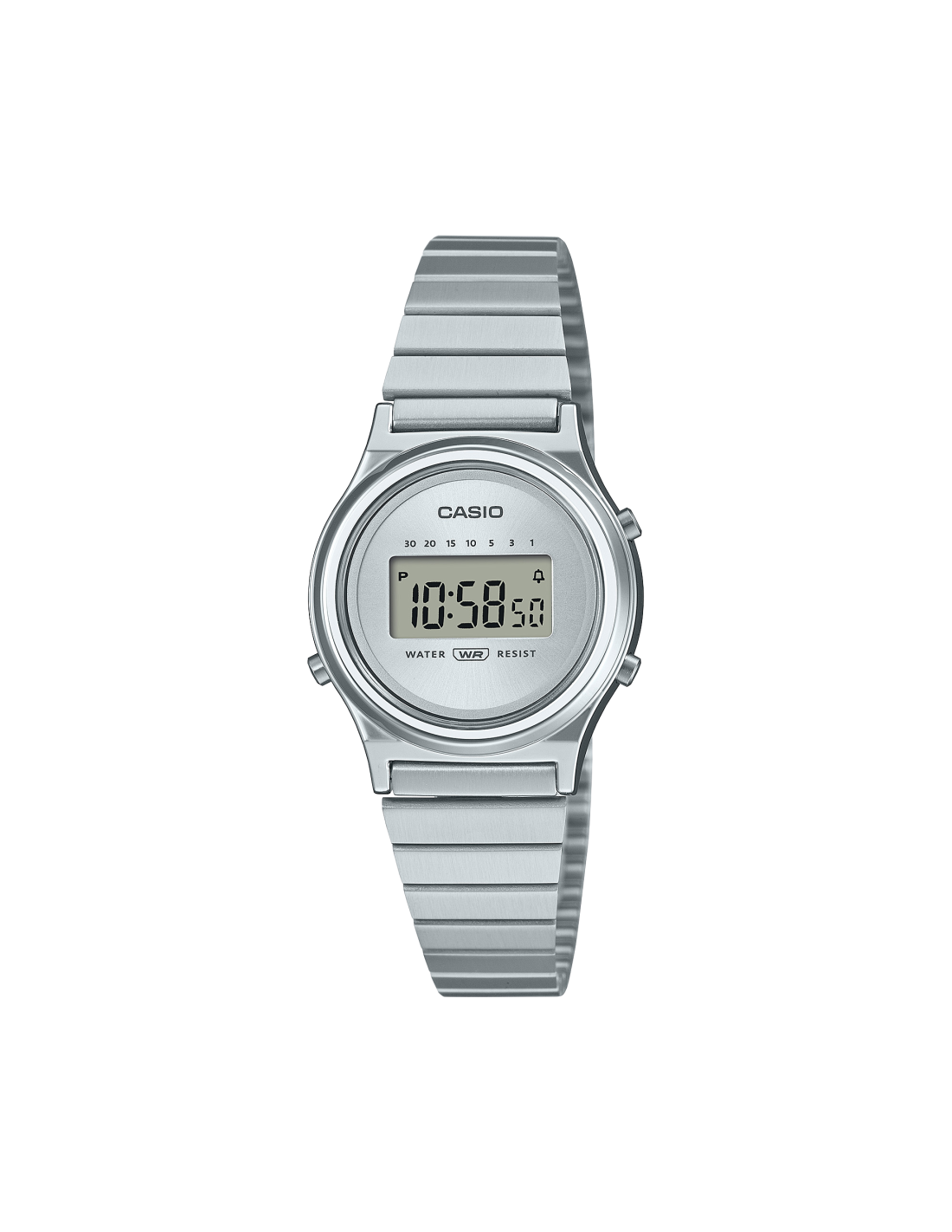 Reloj digital marca Casio colección Vintage. Modelo LA700WE-7AEF. Mini Collection. Se trata de un reloj digital con caja redonda fabricada en resina cromada.