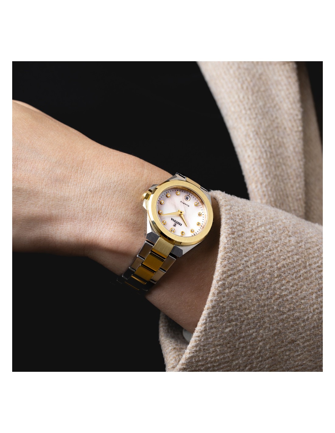 Fabricado en acero inoxidable con cristal mineral y pulsera de acero bicolor. Esfera de nácar. Resistencia al agua 50 metros.