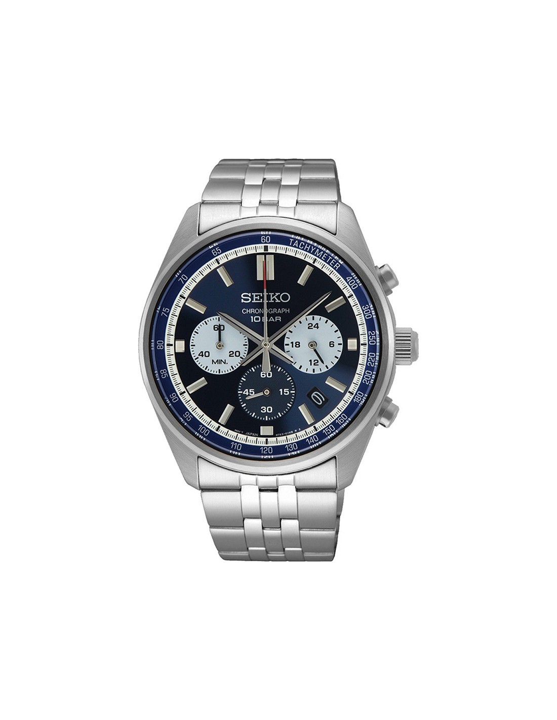 La caja del reloj tiene un diámetro de 40 mm aproximadamente. Cristal mineral Hardlex y movimiento de cuarzo. Esfera azul con calendario. Pulsera de acero plateada con cierre tipo broche desplegable. Tiene una resistencia al agua de 100 metros (10ATM). Cuenta con la garantía oficial Seiko de 24 meses. Se entrega con su caja oficial.