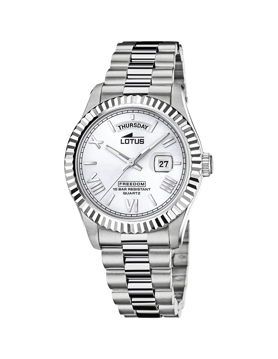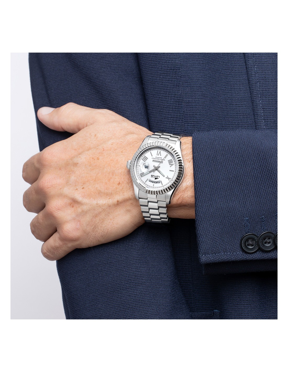 Reloj para hombre fabricado en acero marca Lotus colección Freedom. Esfera blanca con calendario. Se trata de un reloj analógico con caja redonda de acero inoxidable.