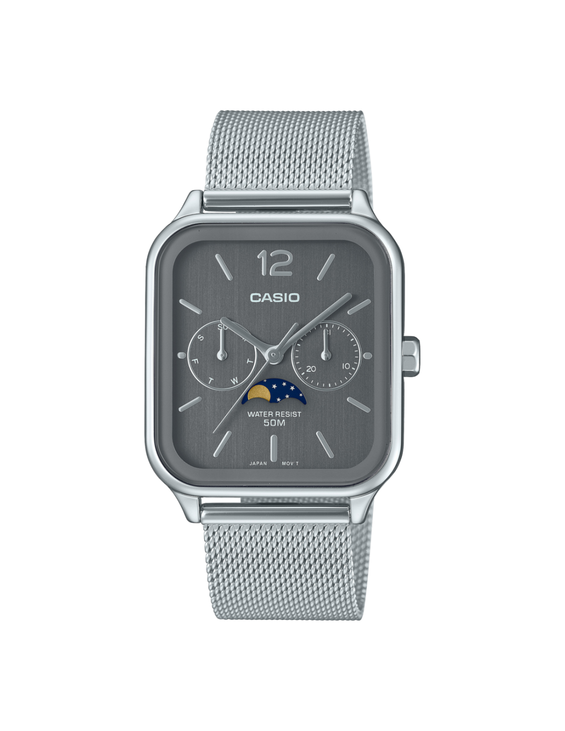 La caja del reloj tiene un ancho de 34 mm aproximadamente. Cristal mineral, esfera color gris con movimiento de cuarzo con calendario y fase lunar. Malla de acero color plateado con cierre tipo broche desplegable. Es resistente al agua 50m y cuenta con la garantía oficial Casio de 36 meses. Se entrega con su caja oficial.