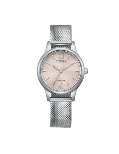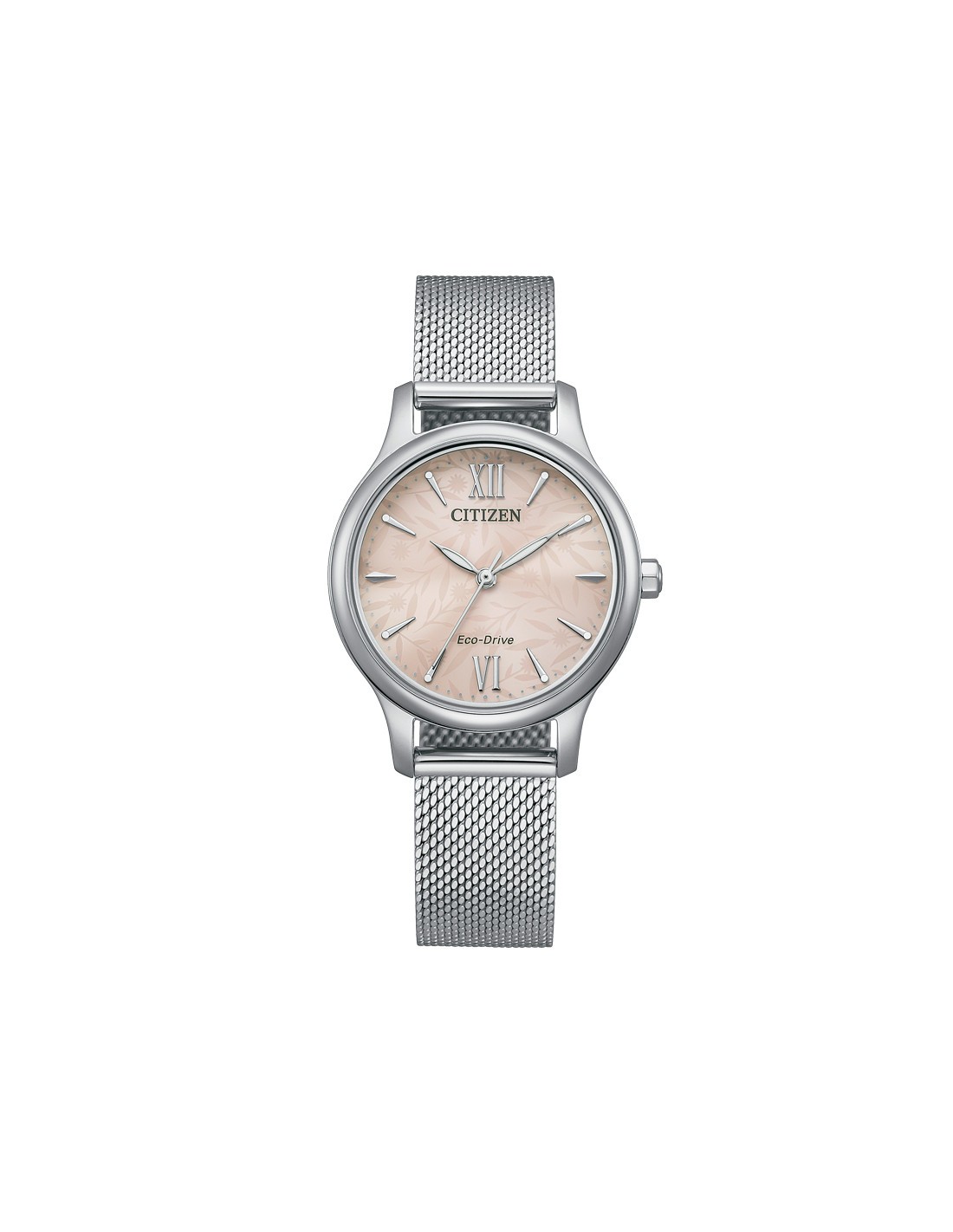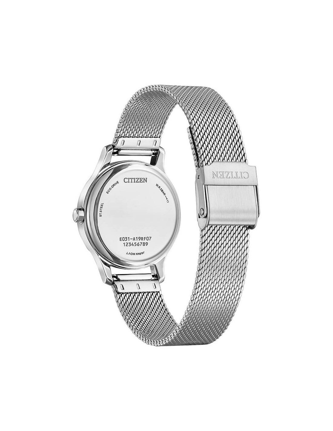 La caja del reloj tiene un diámetro de 30mm. Esfera color rosado. Cristal mineral y movimiento Eco-Drive. Malla de acero color plateada con cierre tipo broche con cierre de seguridad. Tiene una resistencia al agua de 50 metros (5ATM). Cuenta con la garantía oficial Citizen de 3 años. Se entrega con su caja oficial.