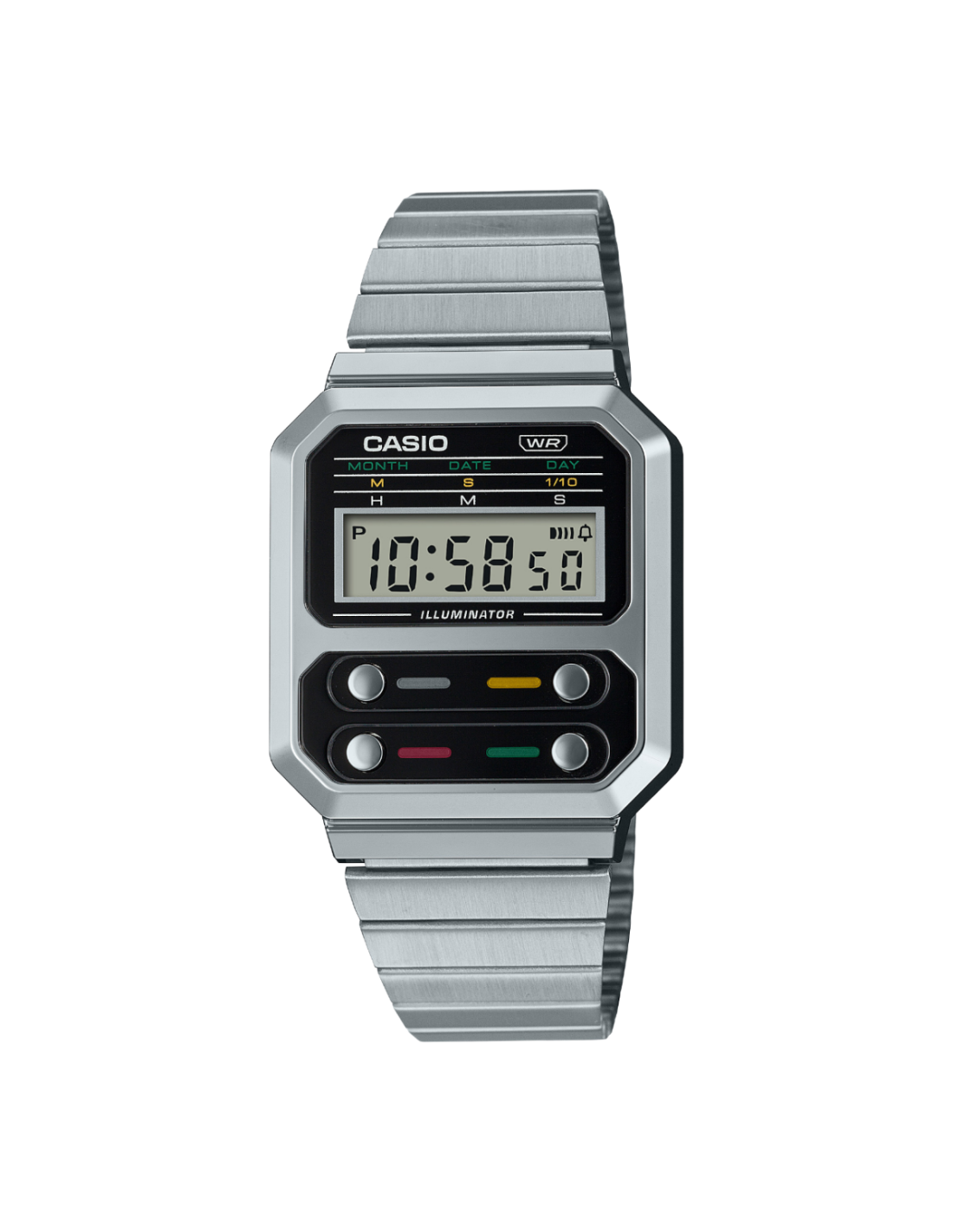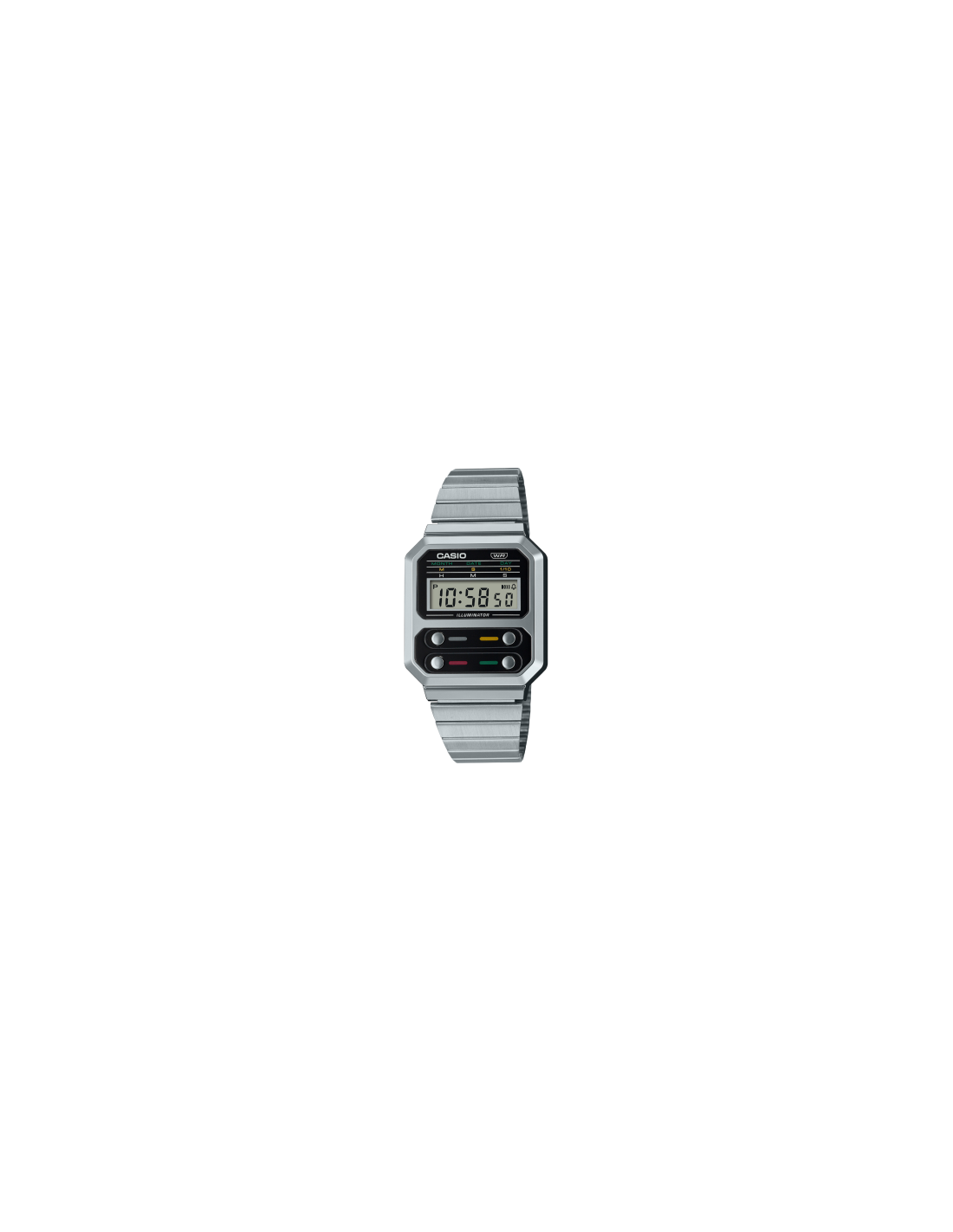 Reloj digital plateado marca Casio colección Vintage. Modelo A100WE-1AEF Se trata de un reloj digital con caja rectangular fabricada en resina cromada.