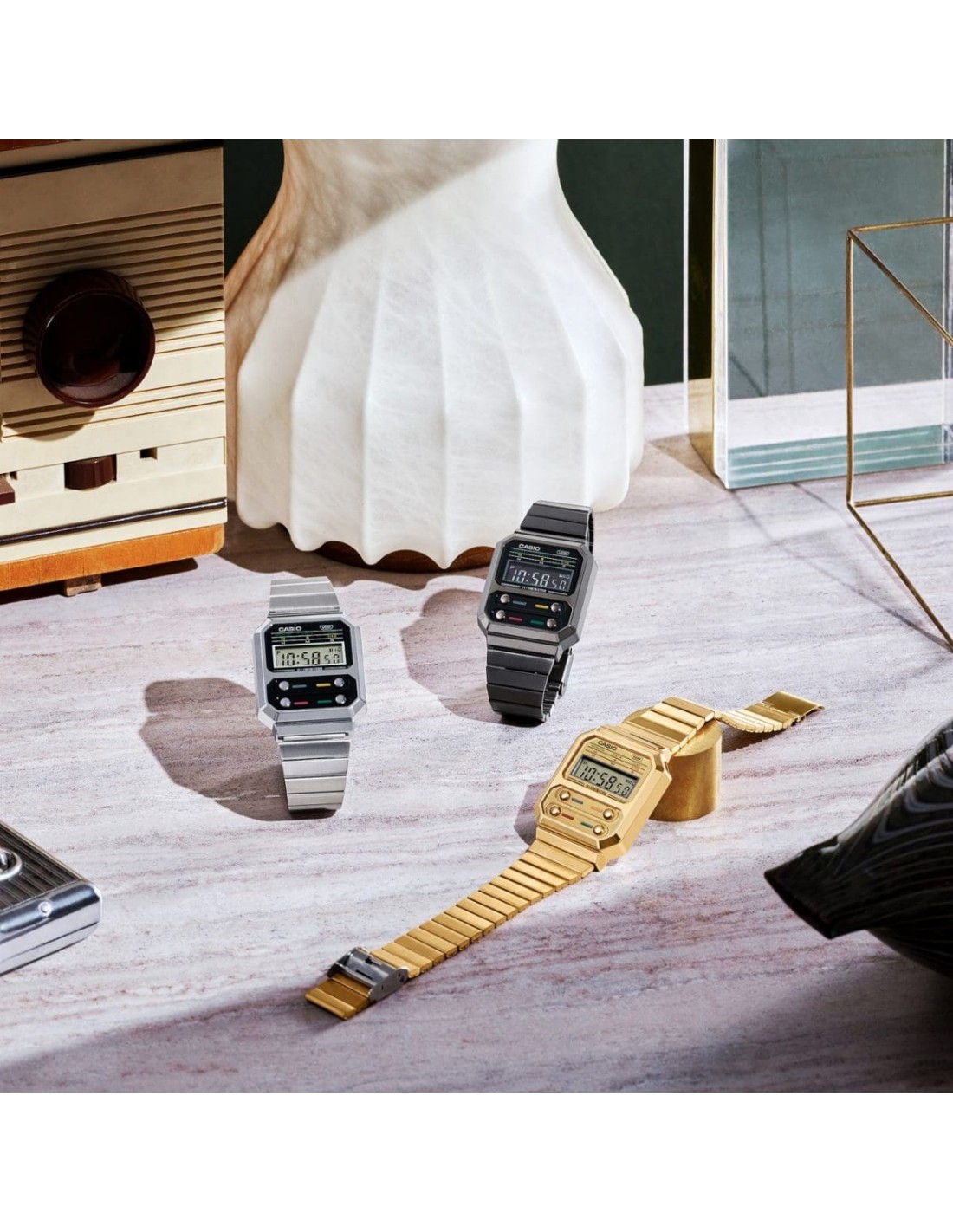 Reloj digital plateado marca Casio colección Vintage. Modelo A100