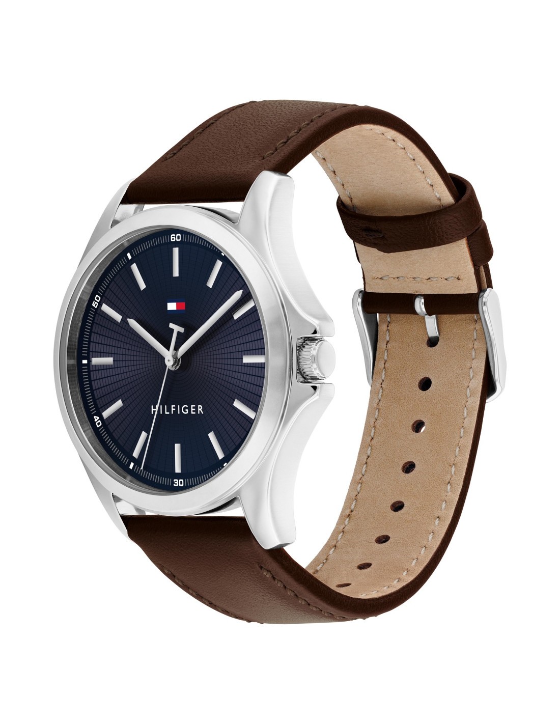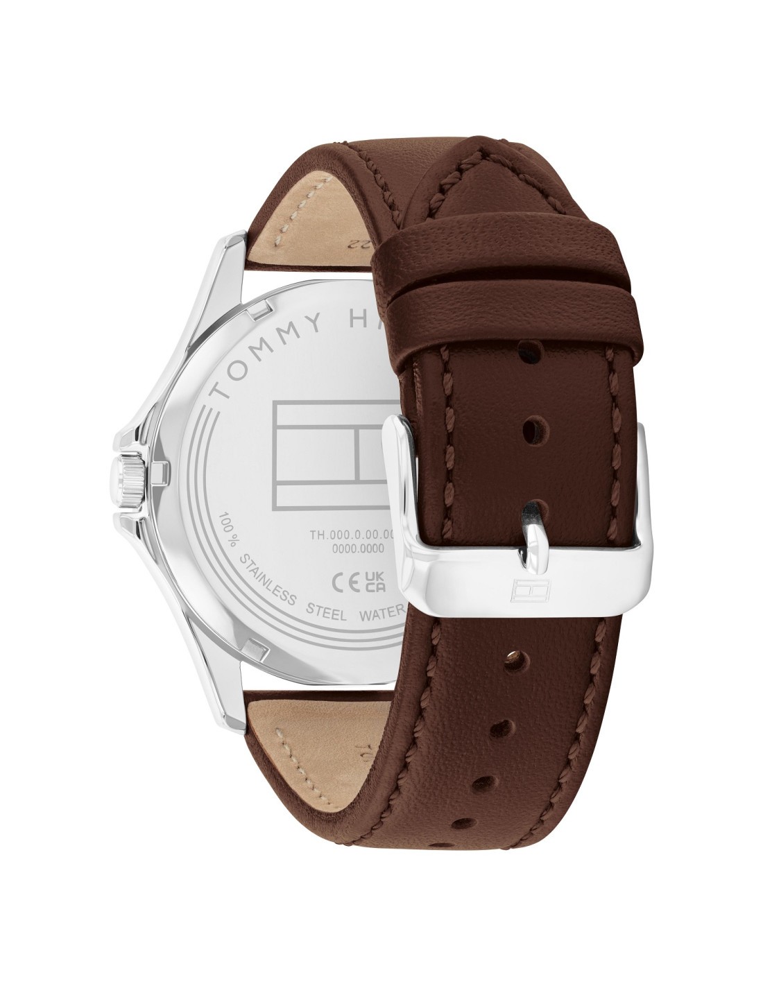 La caja del reloj tiene un diámetro de 42 mm aproximadamente. Cristal mineral y movimiento de cuarzo. Tiene una correa de piel color marrón con cierre tipo hebilla. Tiene una resistencia al agua de 30m (3ATM). Cuenta con la garantía oficial Tommy Hilfiger de 24 meses. Se entrega con su caja oficial.