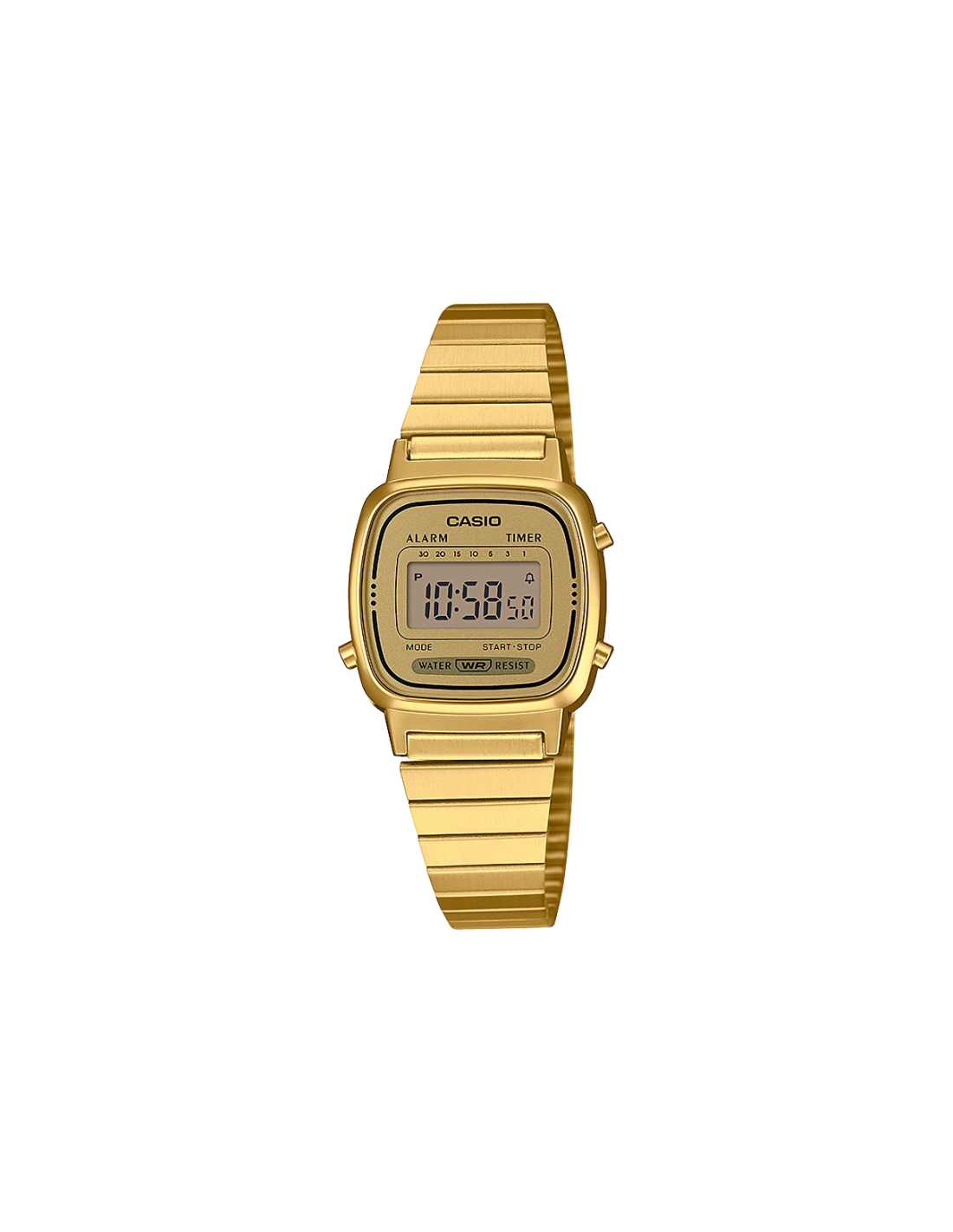Reloj digital marca Casio colección Vintage. Modelo LA670WEGA-9EF. Mini Collection. Se trata de un reloj digital con caja cuadrada fabricada en resina dorada.