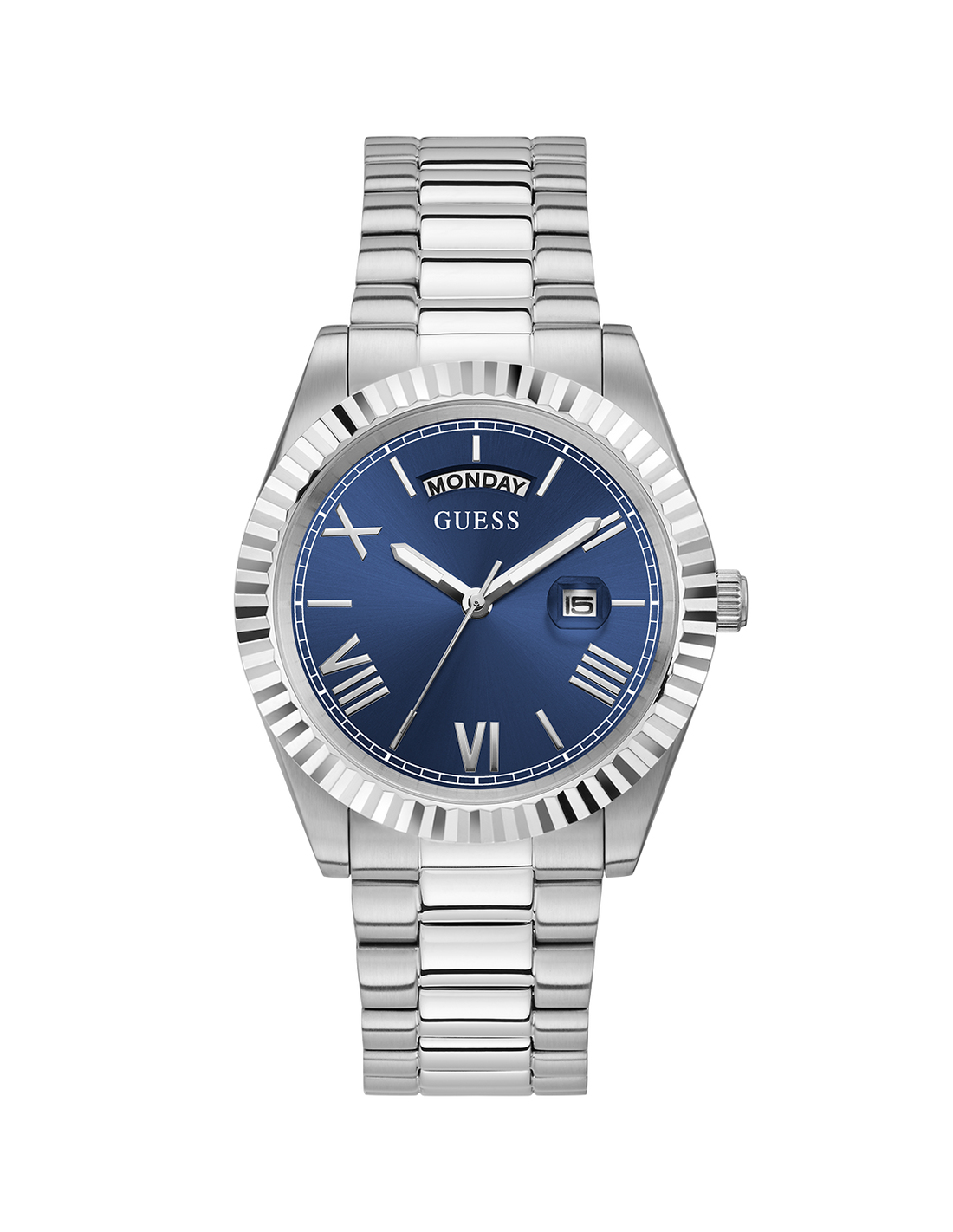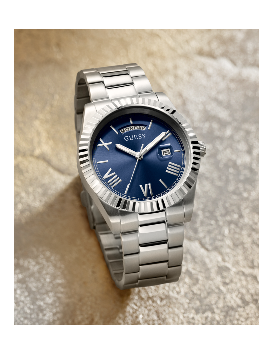 La caja del reloj tiene un diámetro de 42 mm aproximadamente. Cristal mineral y movimiento de cuarzo. Esfera azul con calendario y pulsera de acero de eslabones con cierre tipo broche desplegable. Tiene una resistencia al agua de 50 metros (5ATM). Cuenta con la garantía oficial Guess de 24 meses. Se entrega con su caja oficial.