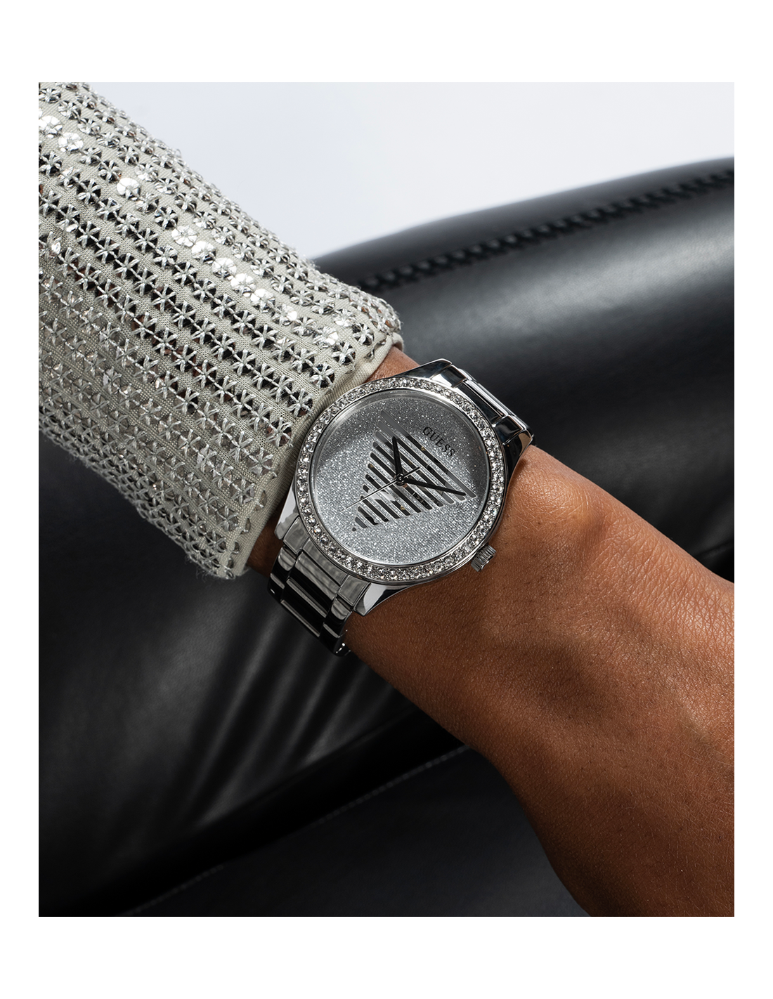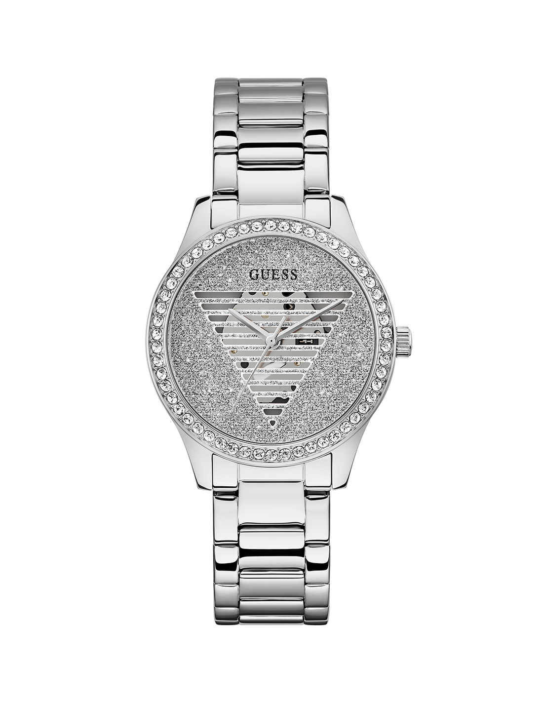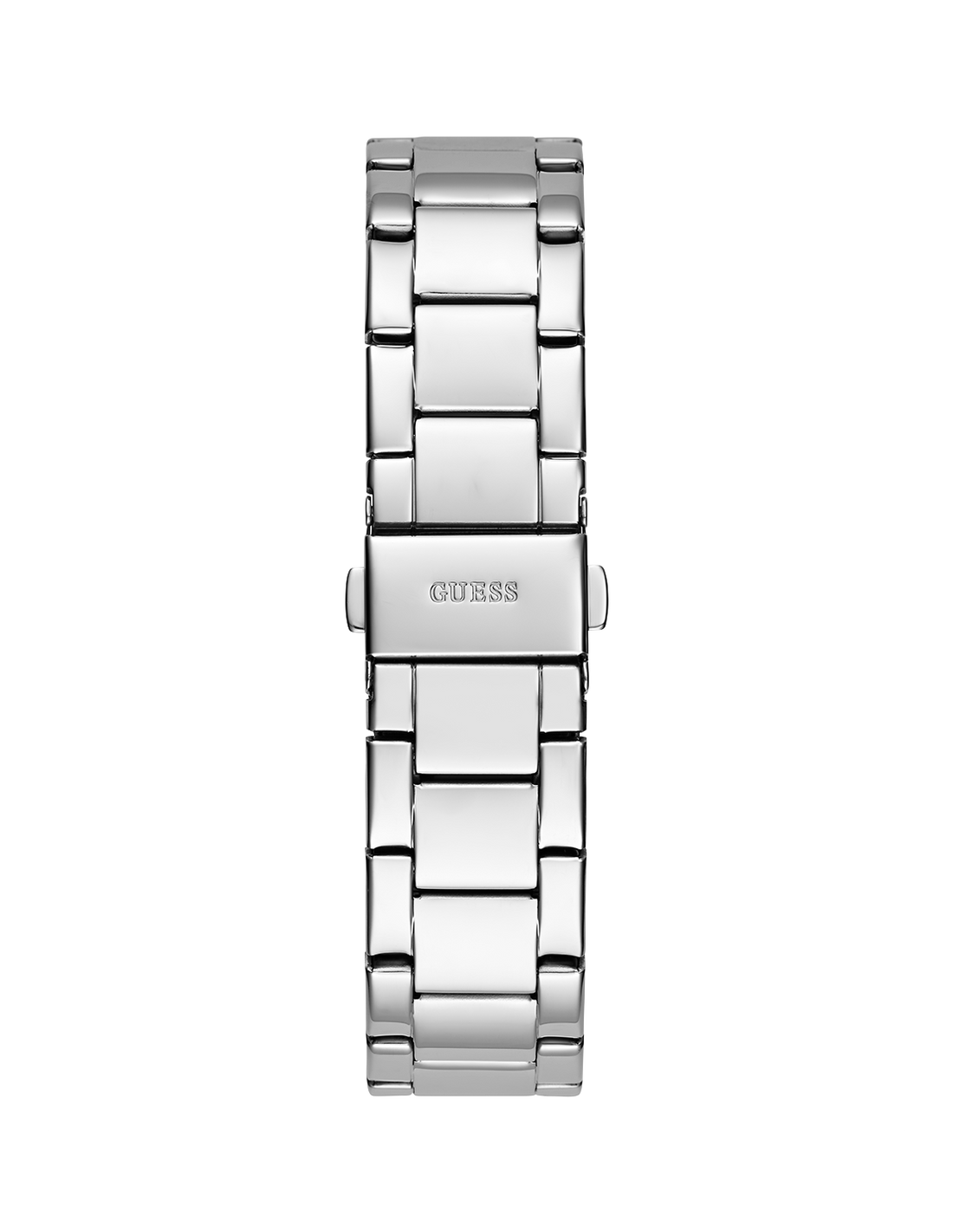 La caja del reloj tiene un diámetro de 38 mm aproximadamente. Cristal mineral y movimiento de cuarzo. Esfera color plata y pulsera plateada de acero con cierre tipo broche desplegable. Tiene una resistencia al agua de 30 metros (3ATM). Cuenta con la garantía oficial Guess de 24 meses. Se entrega con su caja oficial.