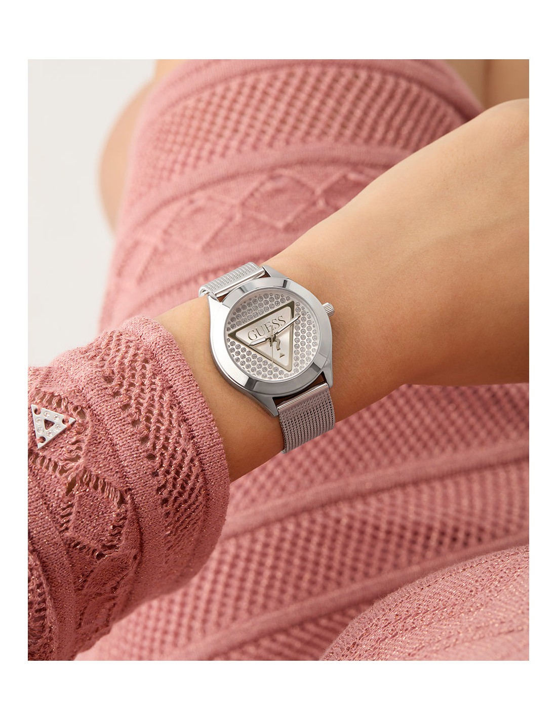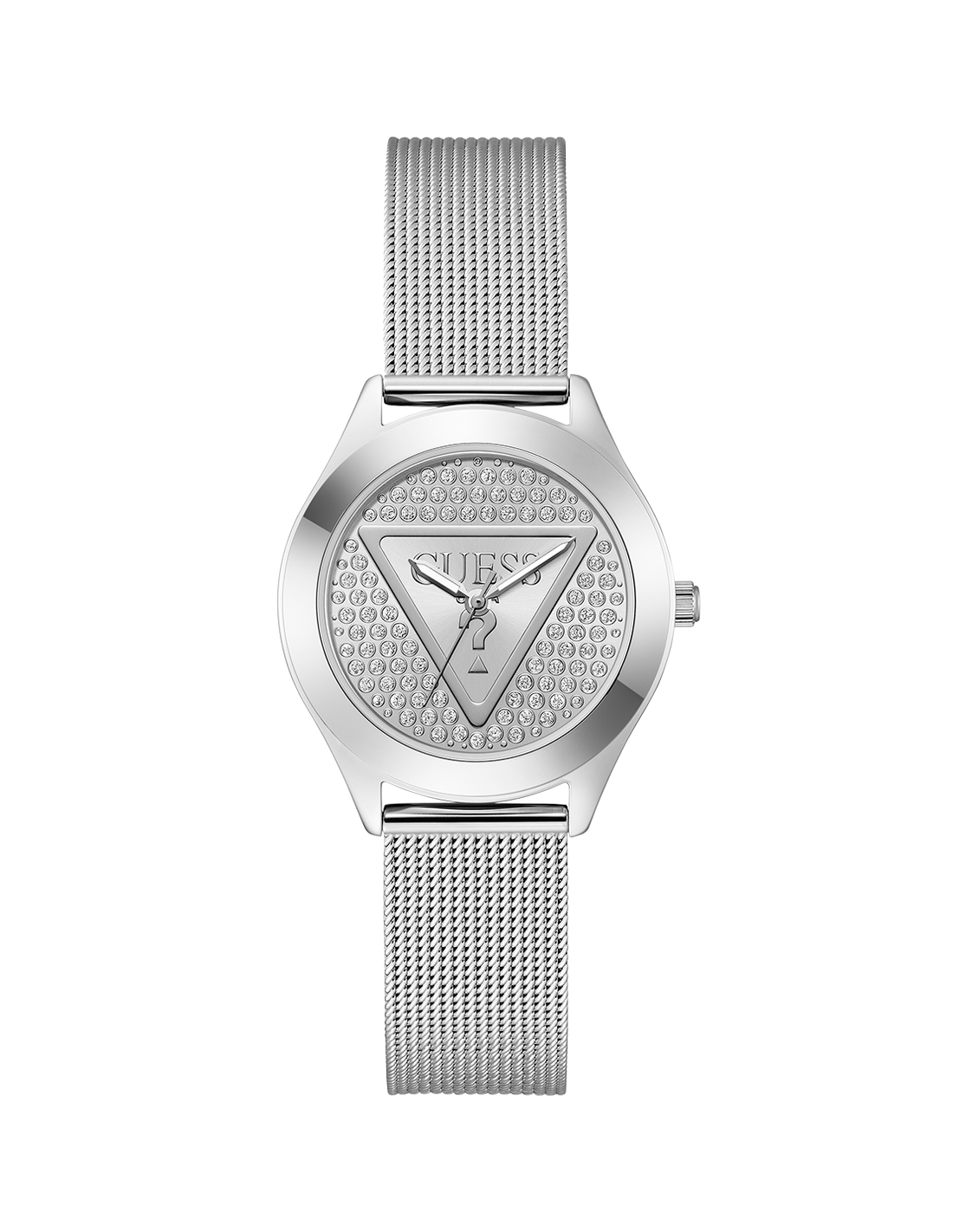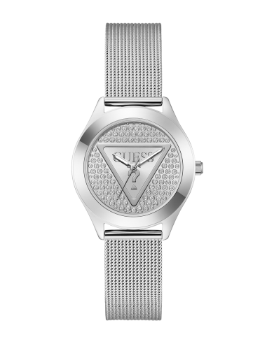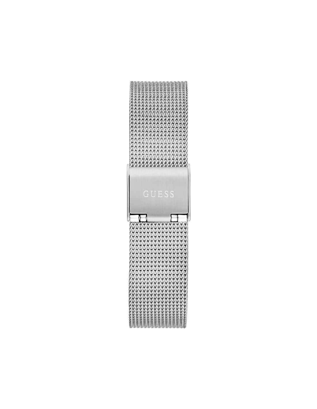 La caja del reloj tiene un diámetro de 34 mm aproximadamente. Cristal mineral y movimiento de cuarzo. Esfera color plata y pulsera plateada tipo malla de acero con cierre tipo broche. Tiene una resistencia al agua de 30 metros (3ATM). Cuenta con la garantía oficial Guess de 24 meses. Se entrega con su caja oficial.