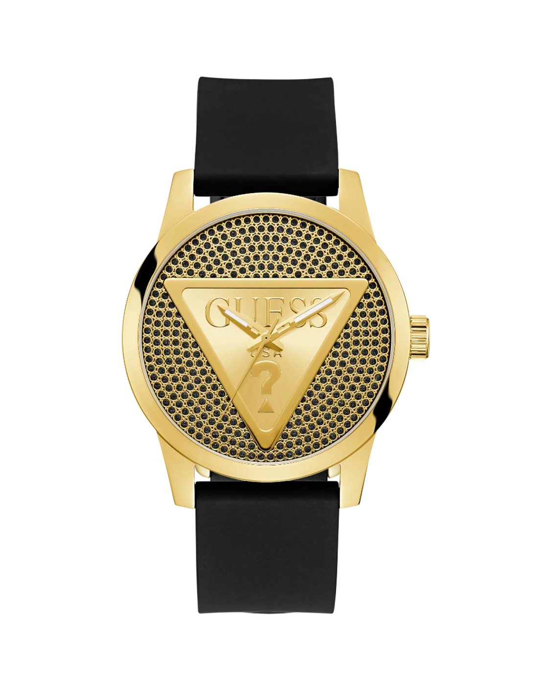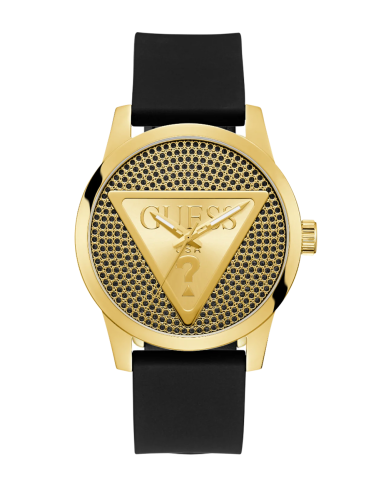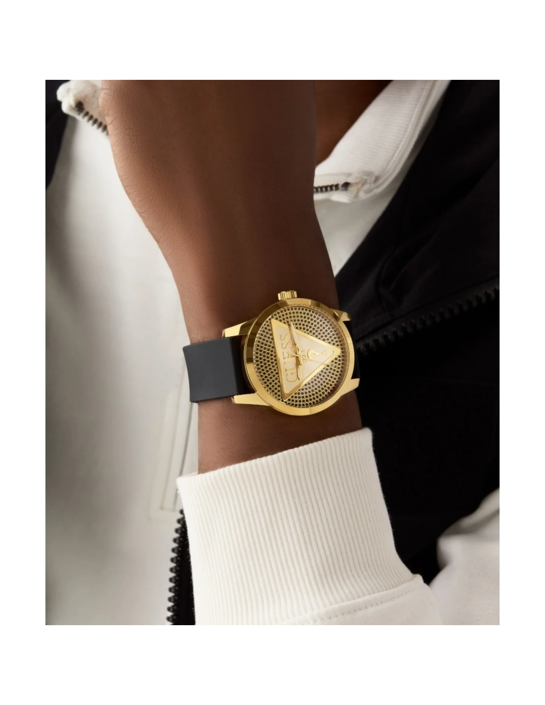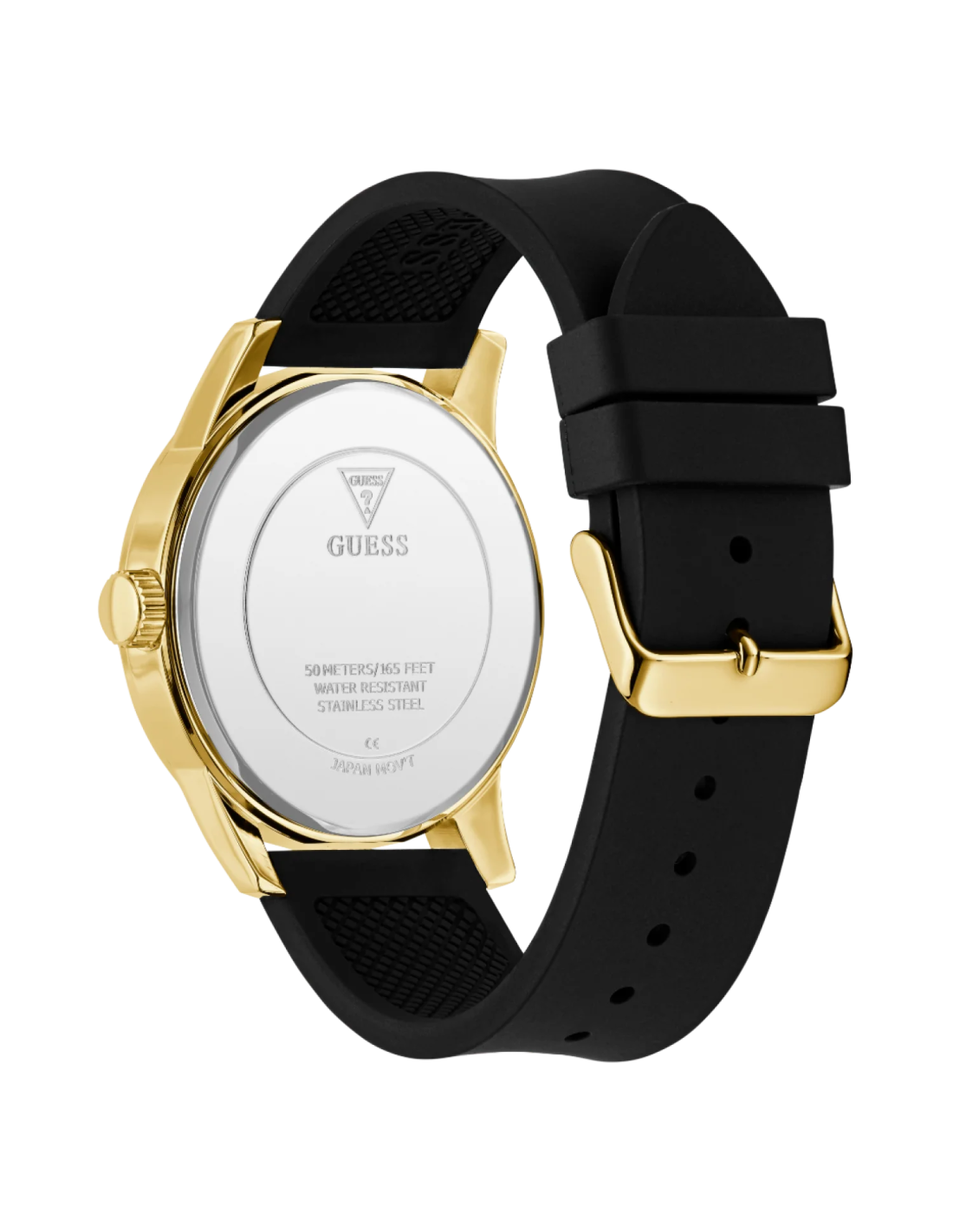 La caja del reloj tiene un diámetro de 44 mm aproximadamente. Cristal mineral y movimiento de cuarzo. Esfera color dorado y correa de silicona color negro con cierre tipo hebilla. Tiene una resistencia al agua de 50 metros (5ATM). Cuenta con la garantía oficial Guess de 24 meses. Se entrega con su caja oficial.
