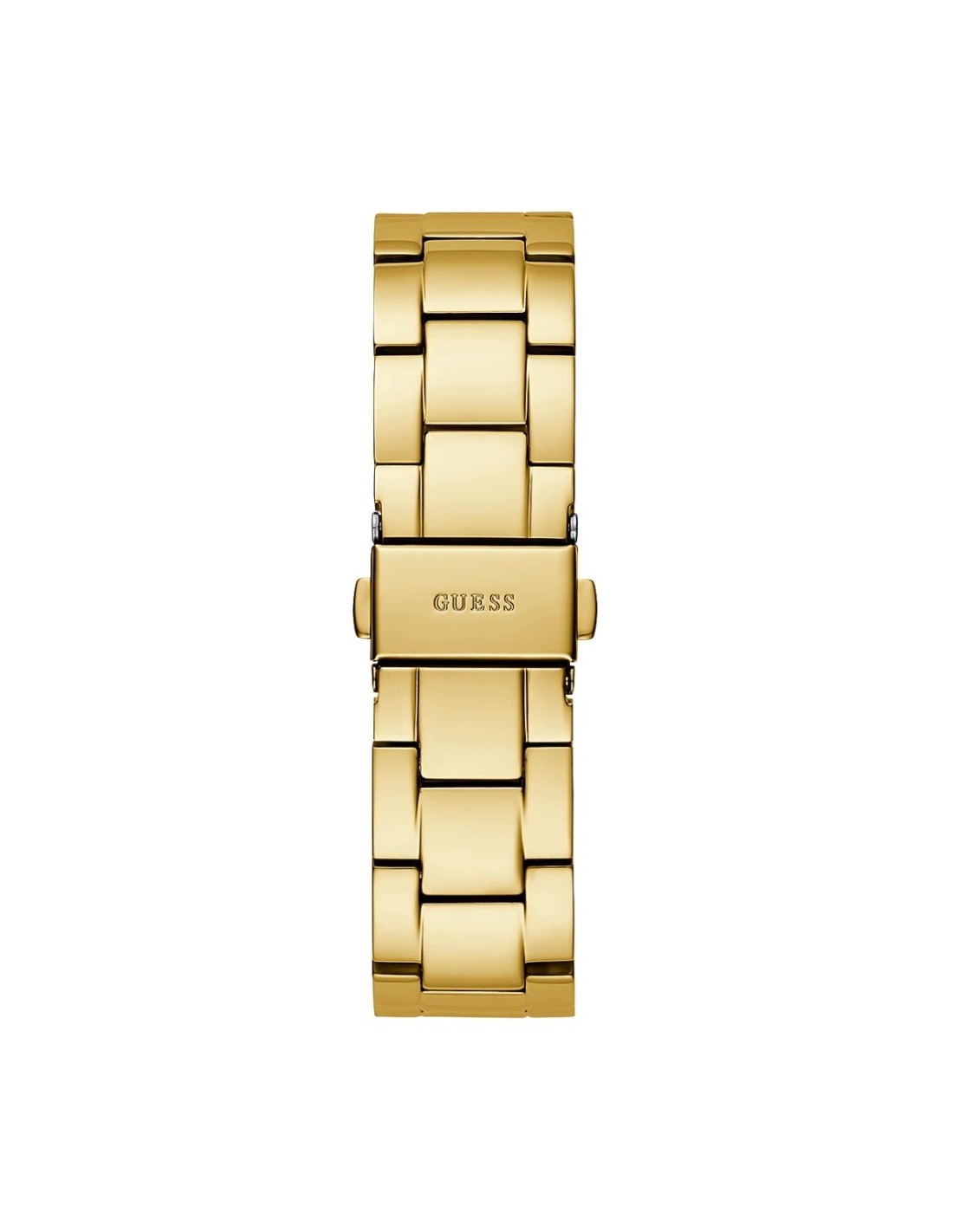La caja del reloj tiene un diámetro de 36 mm aproximadamente. Cristal mineral y movimiento de cuarzo. Esfera color dorado y pulsera de eslabones de acero color dorado con cierre tipo desplegable. Tiene una resistencia al agua de 30 metros (3ATM). Cuenta con la garantía oficial Guess de 24 meses. Se entrega con su caja oficial.