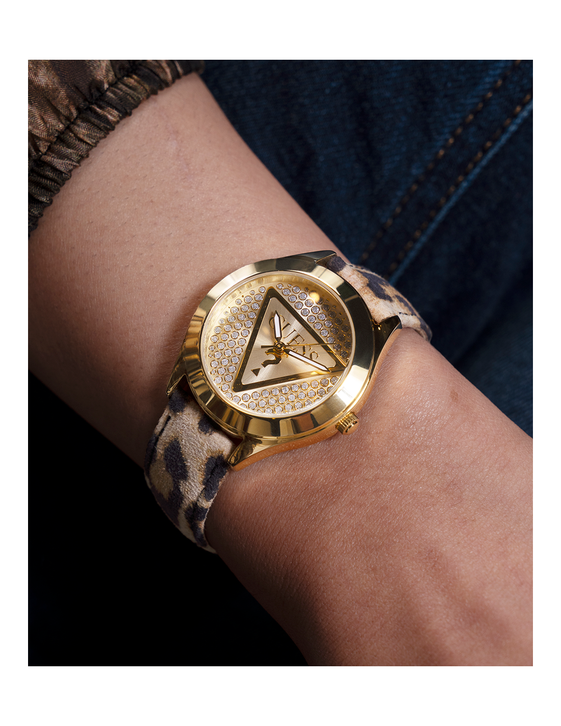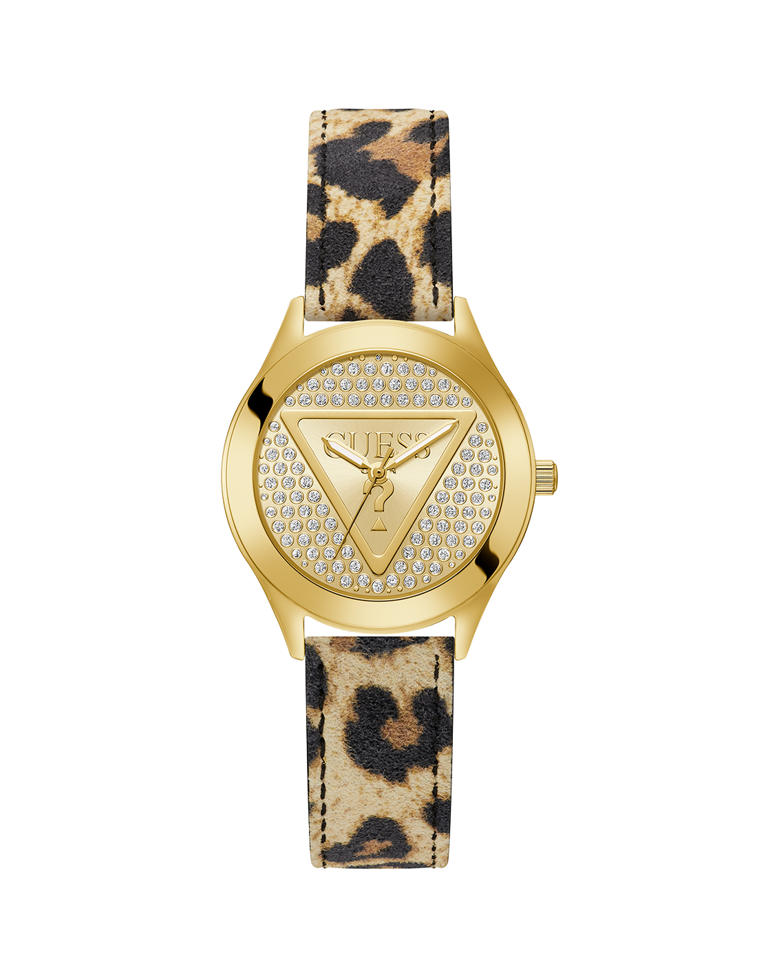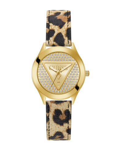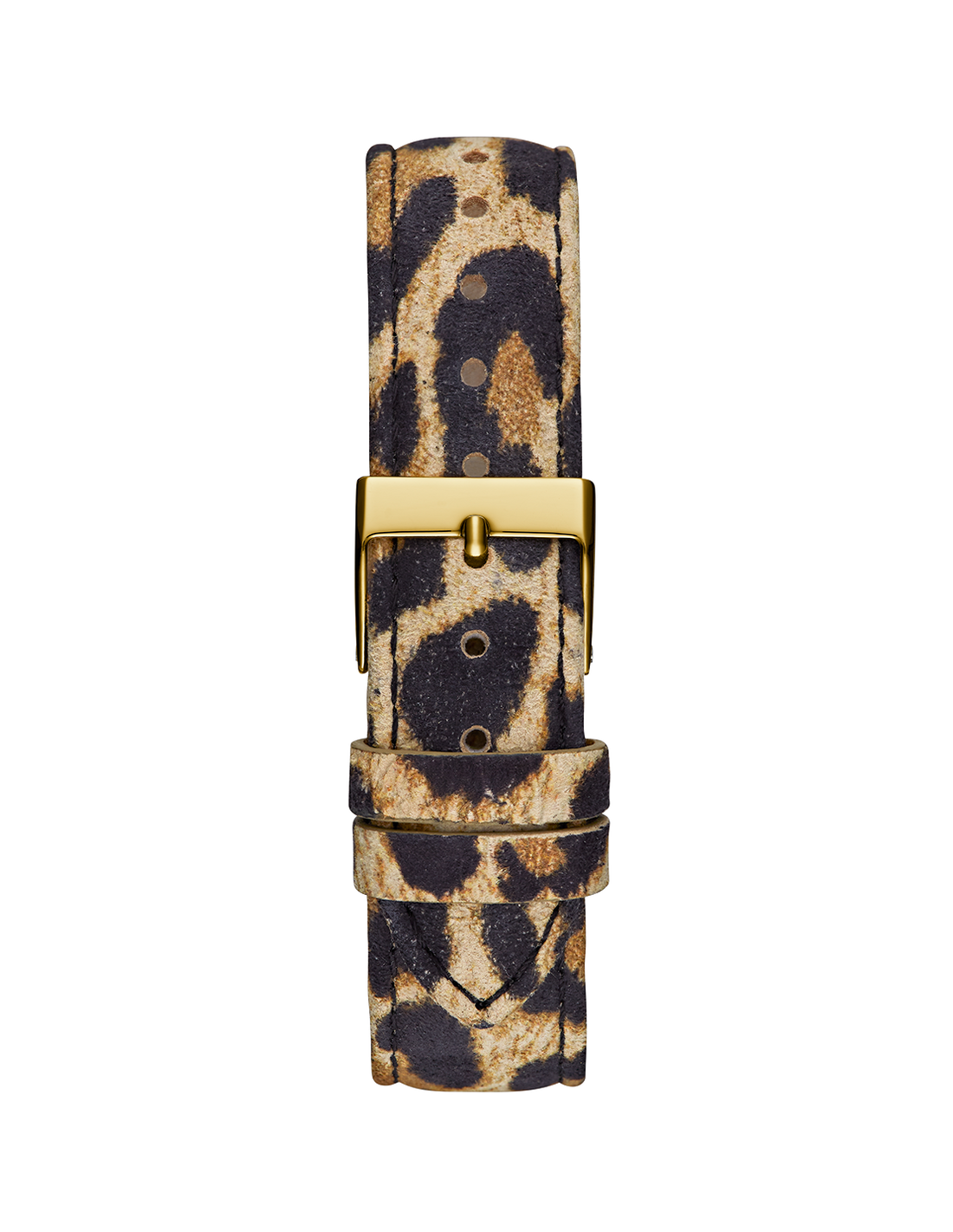 La caja del reloj tiene un diámetro de 34 mm aproximadamente. Cristal mineral y movimiento de cuarzo. Esfera color dorado y correa de piel en tono leopardo con cierre tipo hebilla. Tiene una resistencia al agua de 30 metros (3ATM). Cuenta con la garantía oficial Guess de 24 meses. Se entrega con su caja oficial.