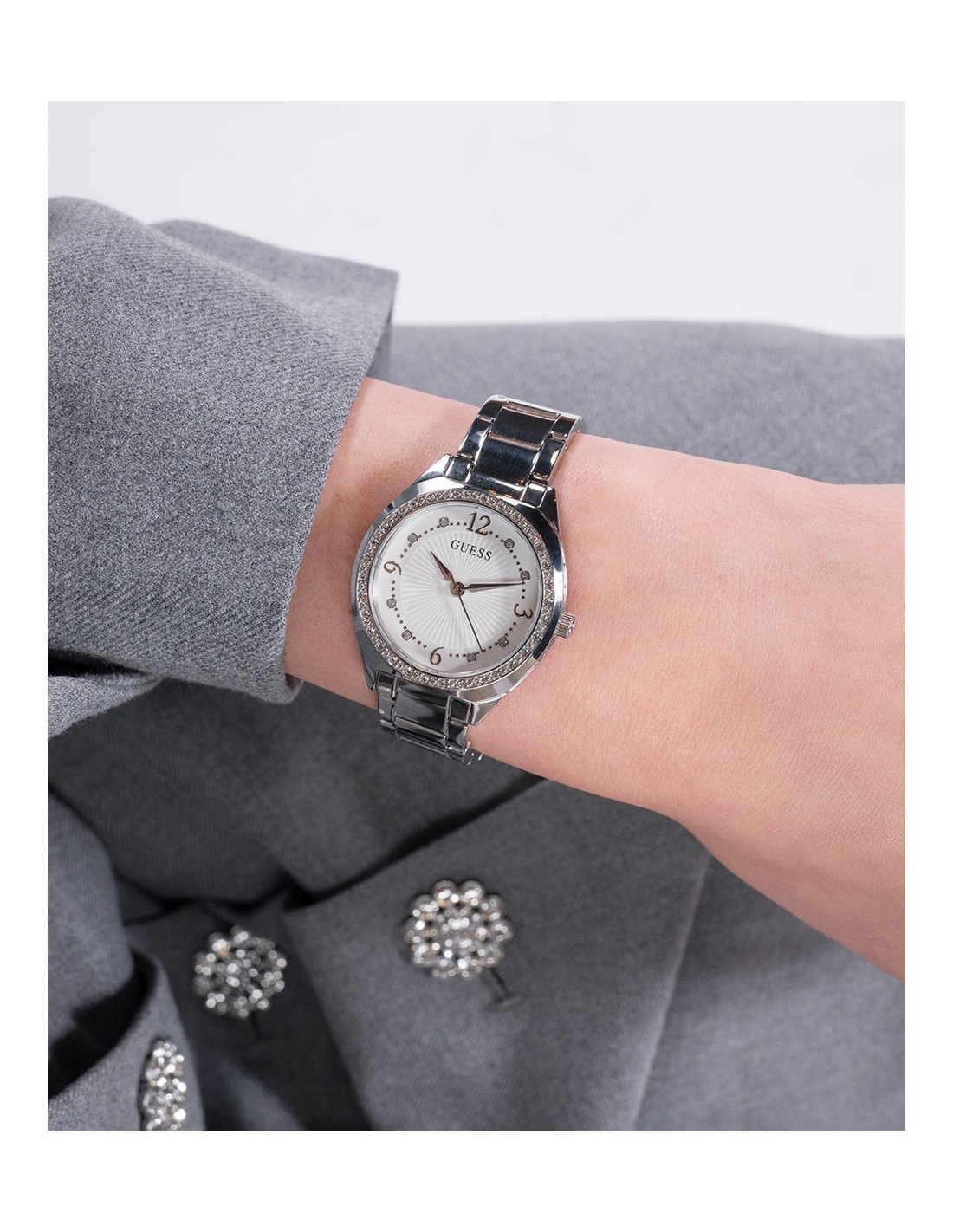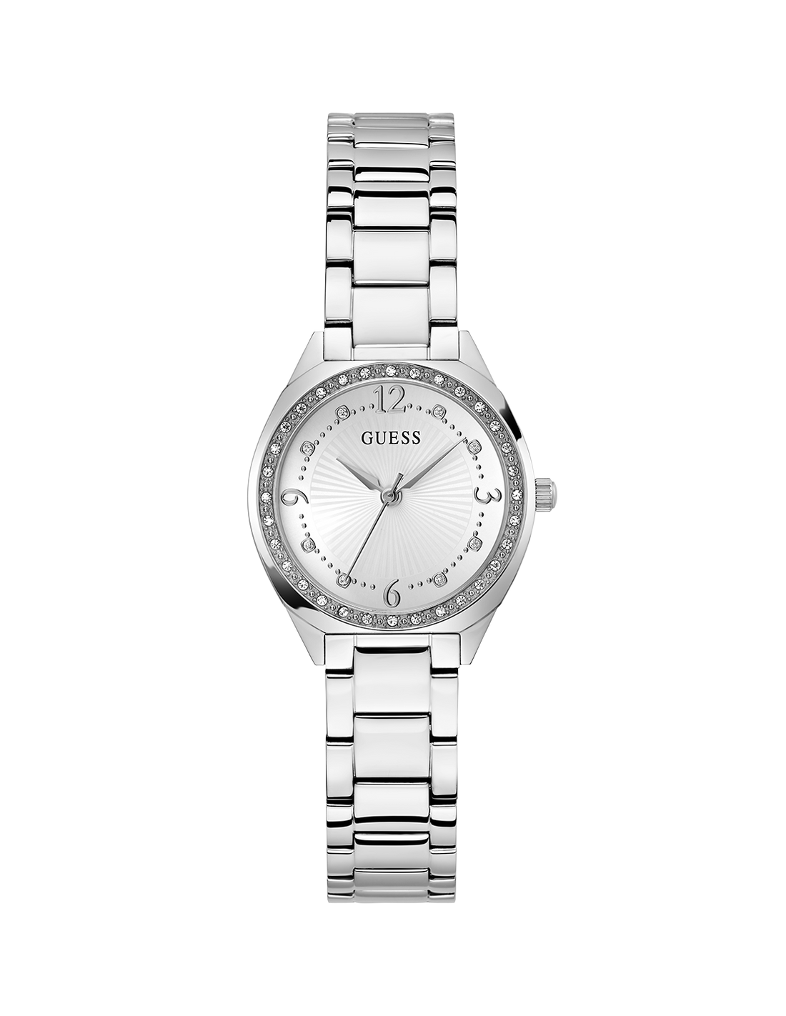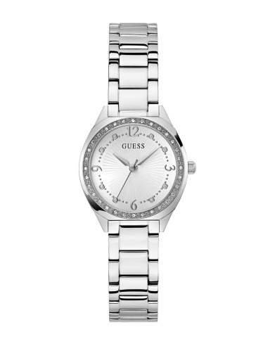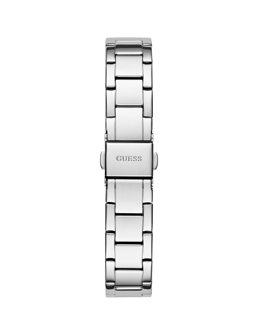 La caja del reloj tiene un diámetro de 30 mm aproximadamente. Cristal mineral y movimiento de cuarzo. Esfera color plata y pulsera plateada de acero con cierre tipo broche desplegable. Tiene una resistencia al agua de 30 metros (3ATM). Cuenta con la garantía oficial Guess de 24 meses. Se entrega con su caja oficial.