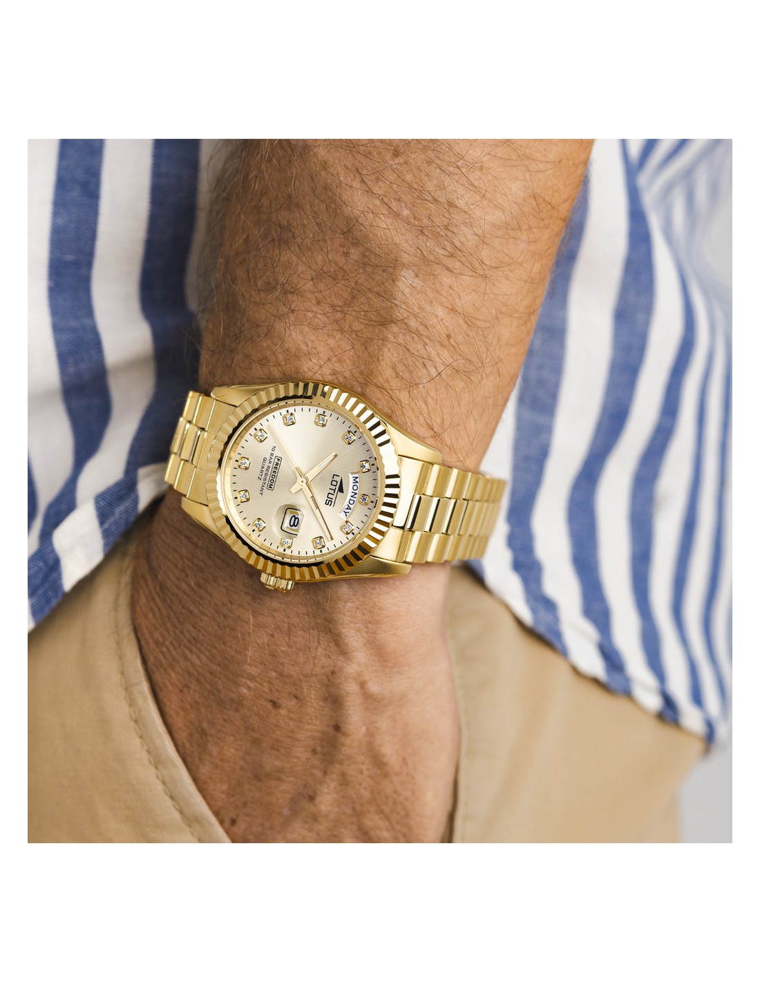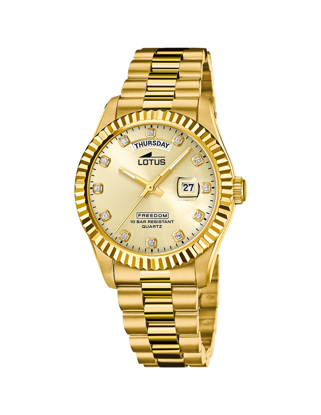 Reloj para hombre fabricado en acero marca Lotus colección Freedom. Esfera color dorado con piedras.