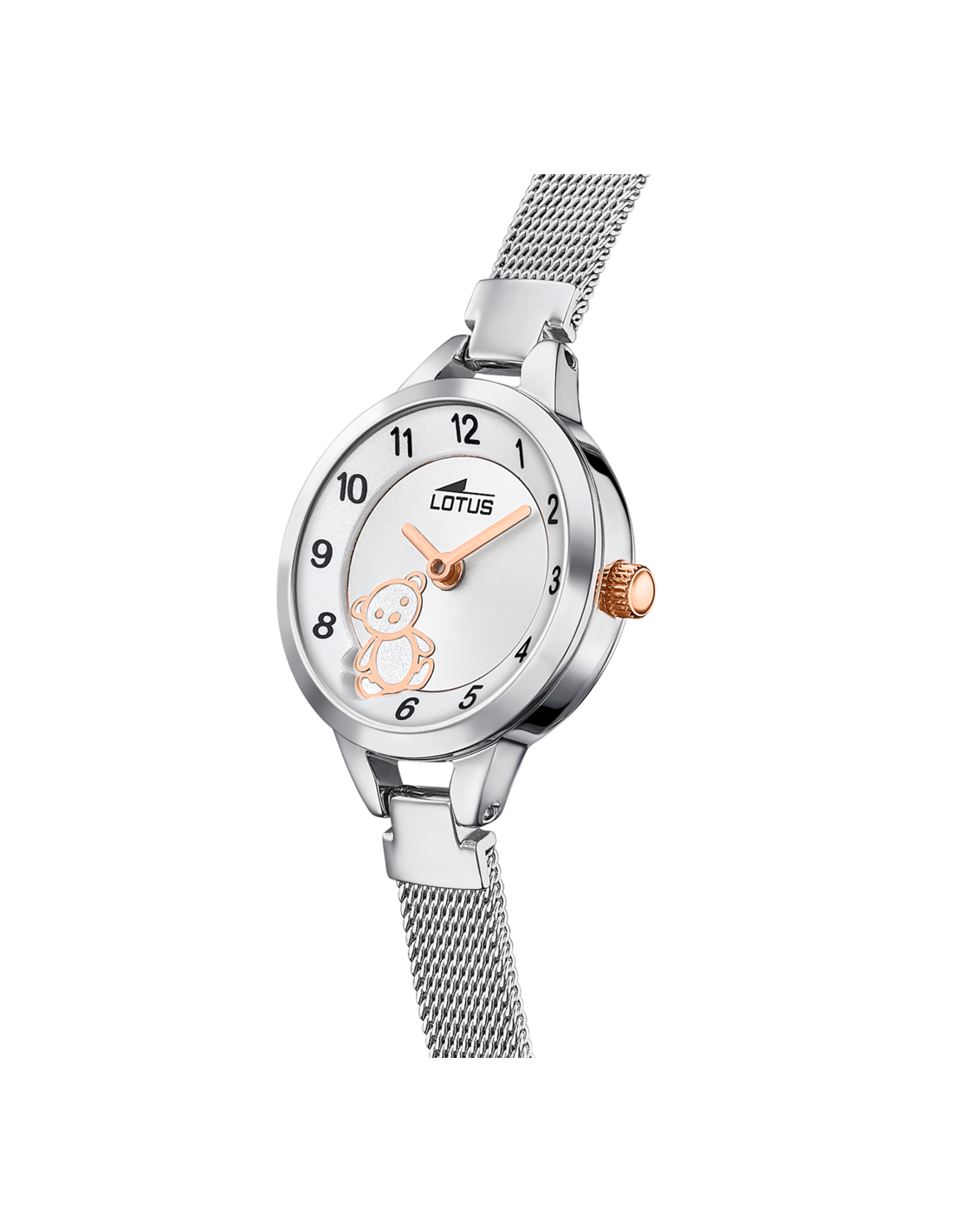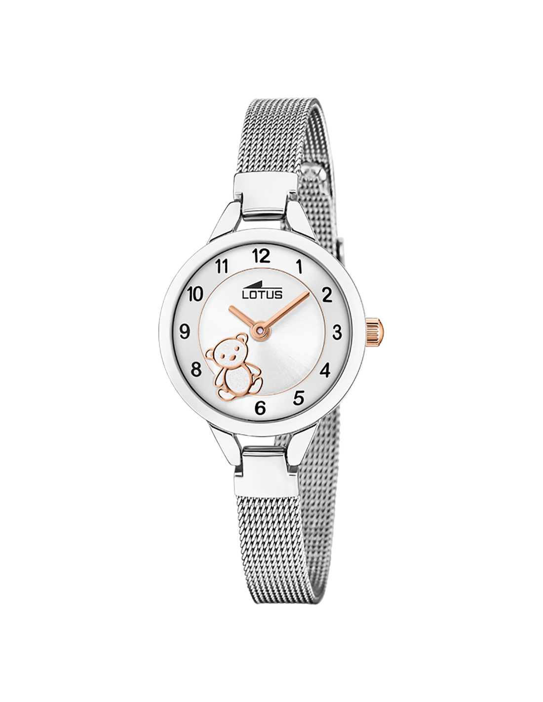Reloj para niña fabricado en acero marca Lotus colección Junior Collection. Esfera con detalle de osito. Por la compra de este reloj de la colección Junior, te regalamos una pulsera.