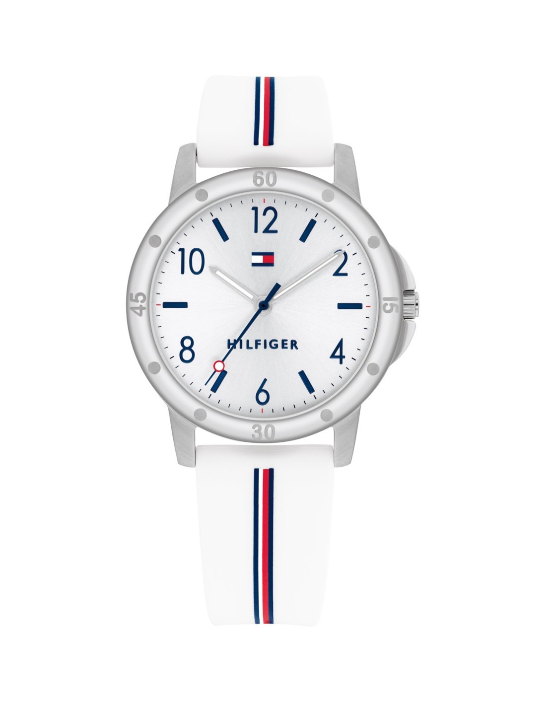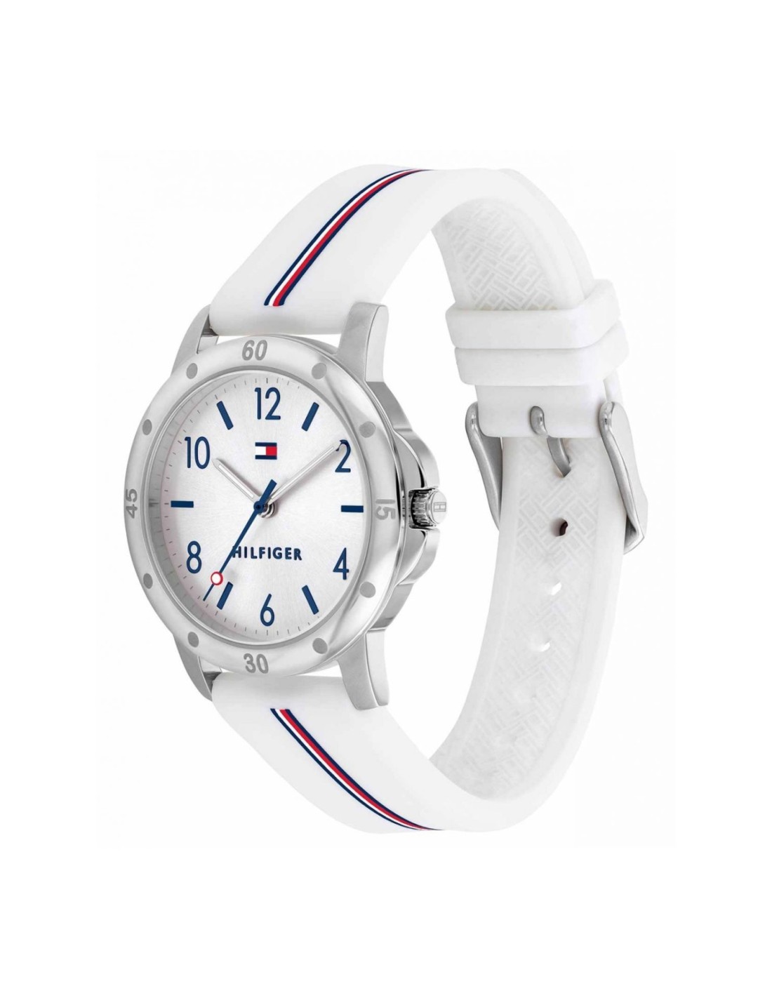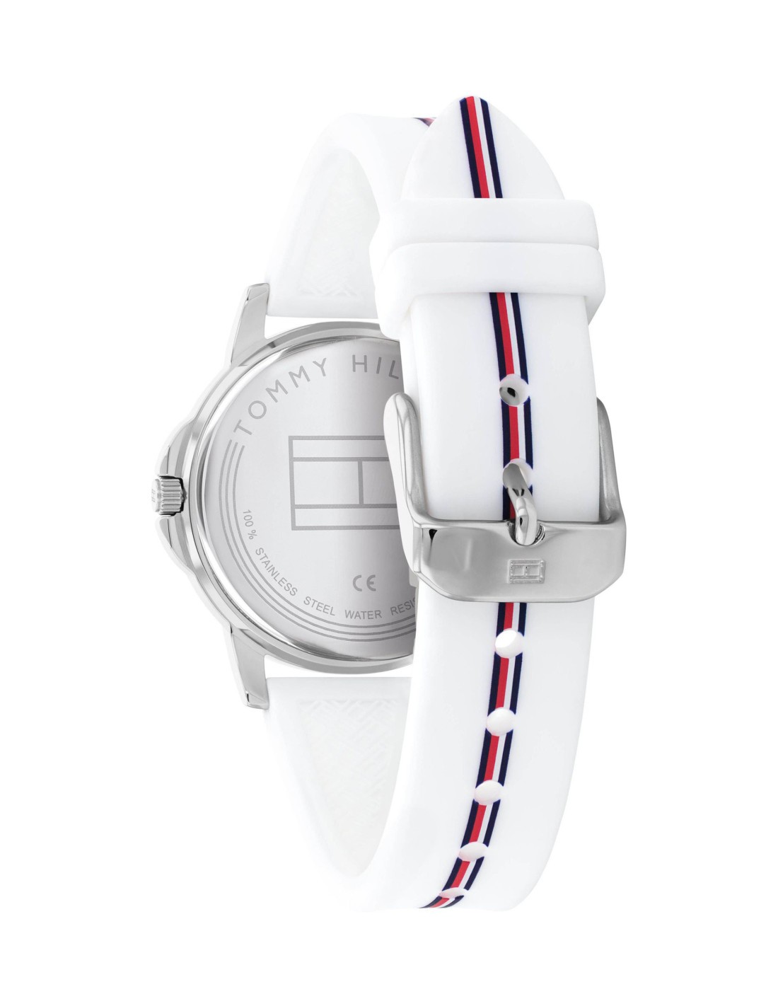 La caja del reloj tiene un diámetro de 32 mm aproximadamente. Cristal mineral y movimiento de cuarzo. La correa es de silicona color blanco con cierre tipo hebilla. Tiene una resistencia al agua de 30m (3ATM). Cuenta con la garantía oficial Tommy Hilfiger de 24 meses. Se entrega con su caja oficial.
