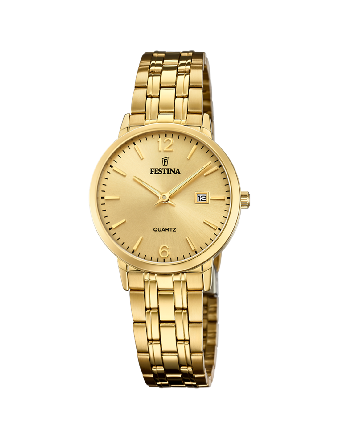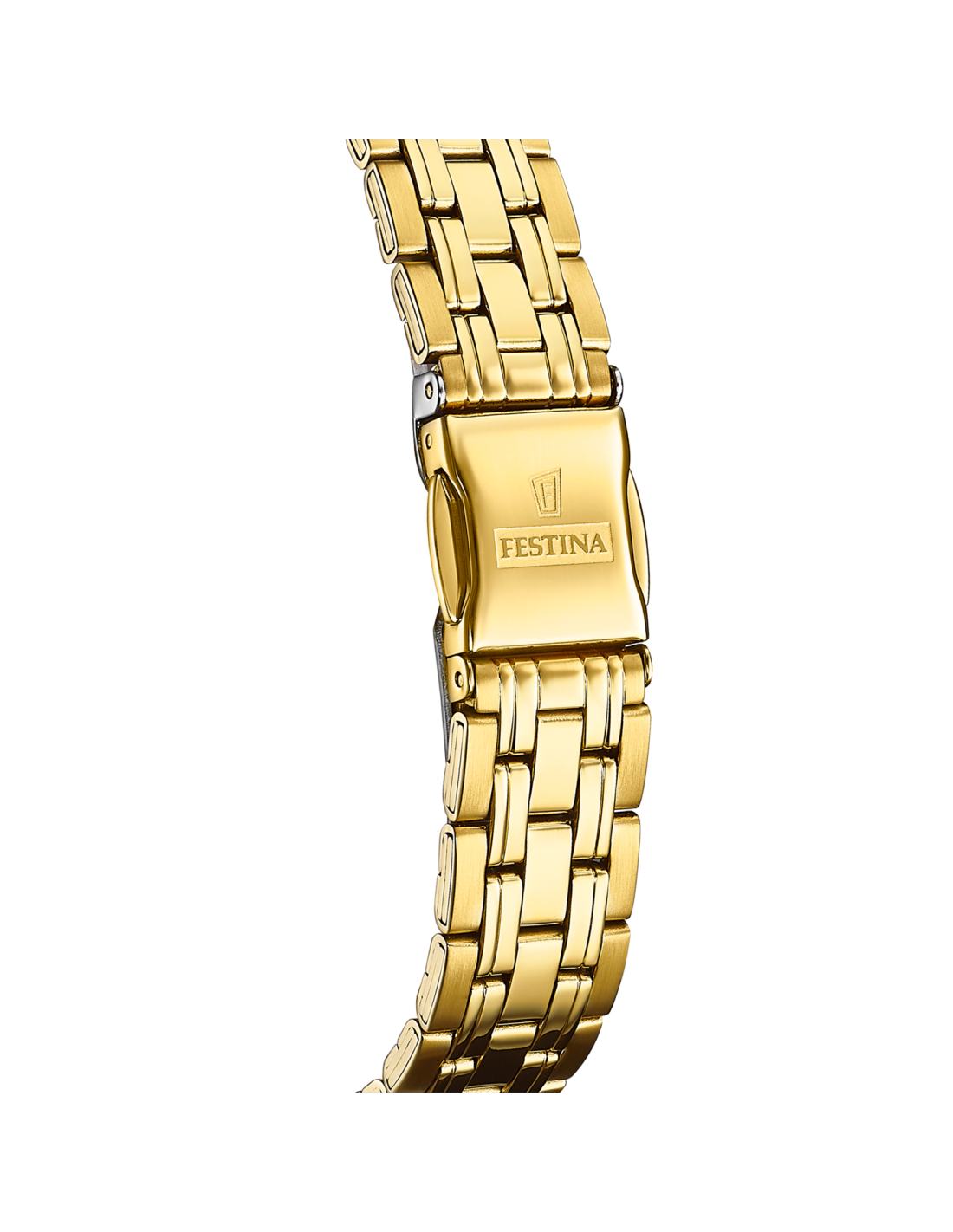 La caja del reloj tiene un diámetro de 30 mm aproximadamente. Cristal mineral y movimiento de cuarzo. Pulsera de acero color ip dorado con cierre tipo desplegable. Tiene una resistencia al agua de 50 metros (5ATM). Cuenta con la garantía oficial Festina de 24 meses. Se entrega con su caja oficial.