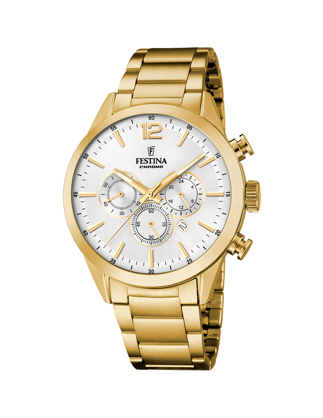 La caja del reloj tiene un diámetro de 43 mm aproximadamente. Esfera blanca. Cristal mineral y movimiento de cuarzo. Pulsera de eslabones de acero color dorado con cierre tipo desplegable. Tiene una resistencia al agua de 50 metros (5ATM). Cuenta con la garantía oficial Festina de 24 meses. Se entrega con su caja oficial.