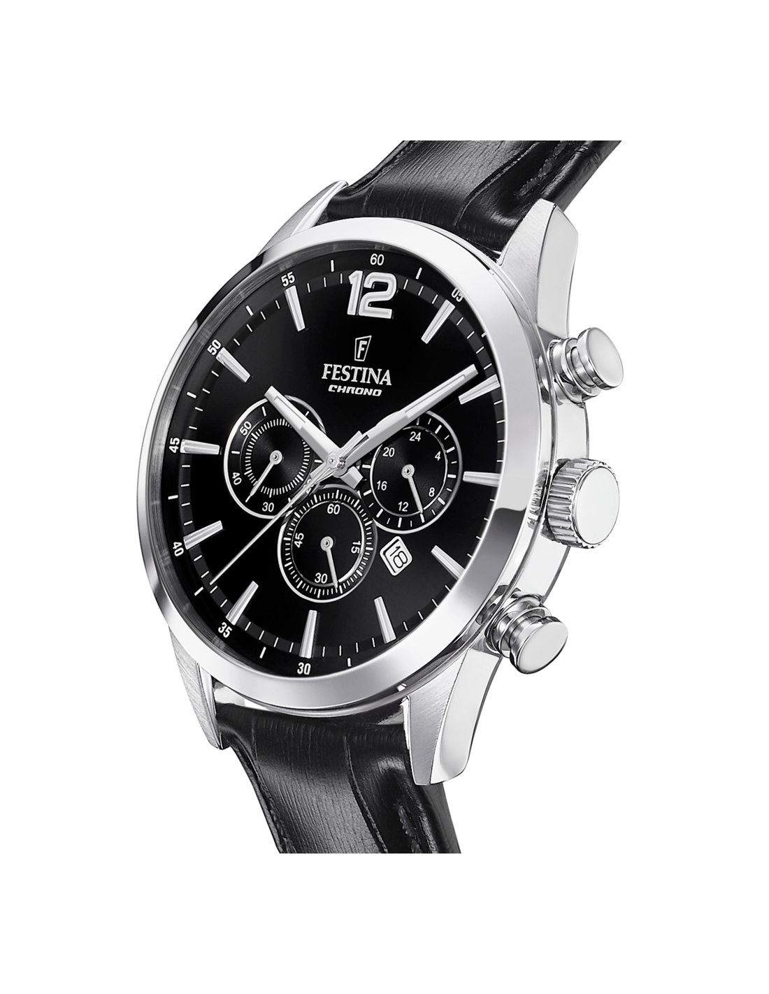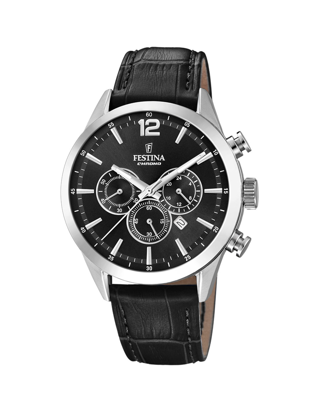 La caja del reloj tiene un diámetro de 43 mm aproximadamente. Esfera negra. Cristal mineral y movimiento de cuarzo. Correa de piel negra con cierre de hebilla. Tiene una resistencia al agua de 50 metros (5ATM). Cuenta con la garantía oficial Festina de 24 meses. Se entrega con su caja oficial.