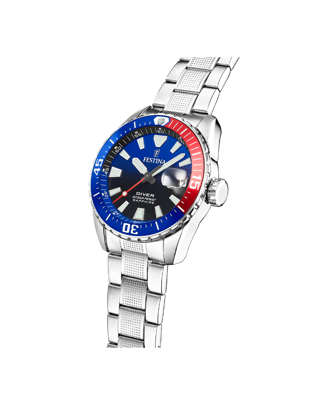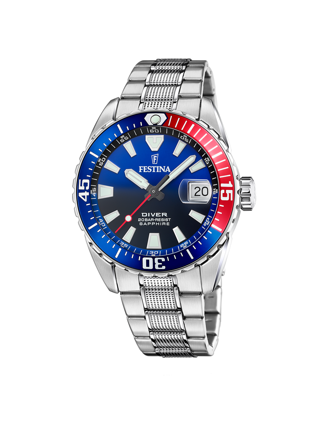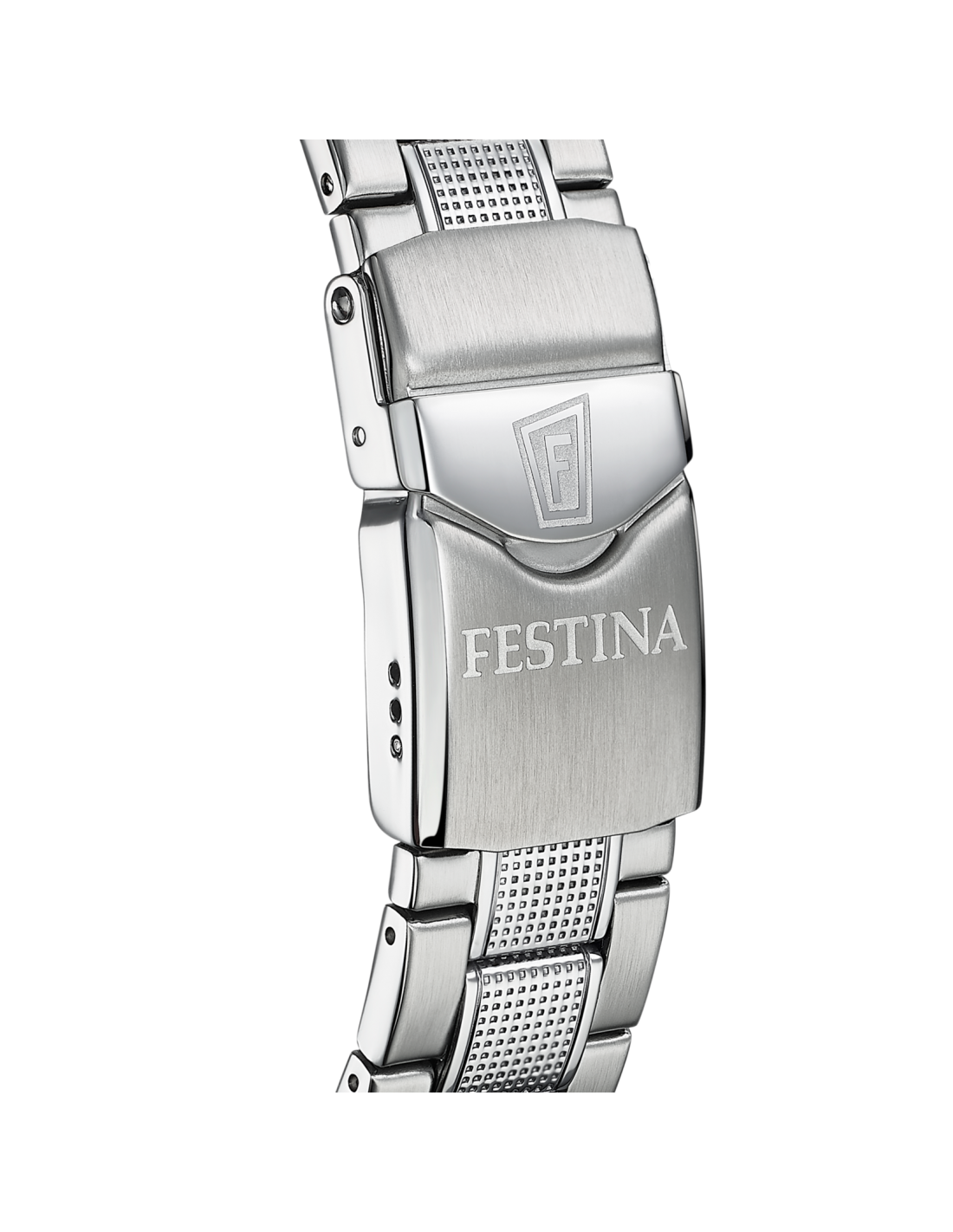 La caja del reloj tiene un diámetro de 41 mm aproximadamente. Esfera azul. Cristal zafiro y movimiento de cuarzo. Pulsera de eslabones de acero color plateado con cierre tipo desplegable con cierre de seguridad. Tiene una resistencia al agua de 200 metros (20ATM). Cuenta con la garantía oficial Festina de 24 meses. Se entrega con su caja oficial.