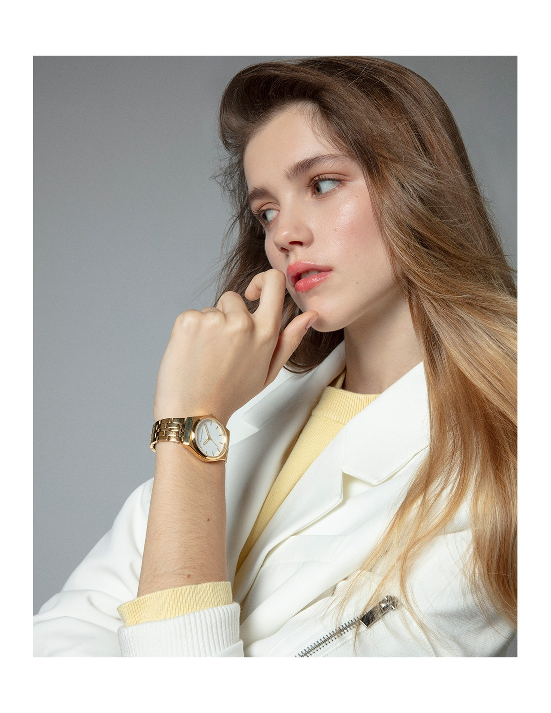 Fabricado en acero inoxidable ip dorado con pulsera de eslabones y con esfera blanca. Resistencia al agua 50 metros.