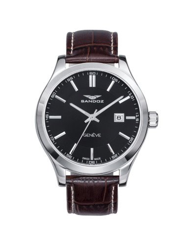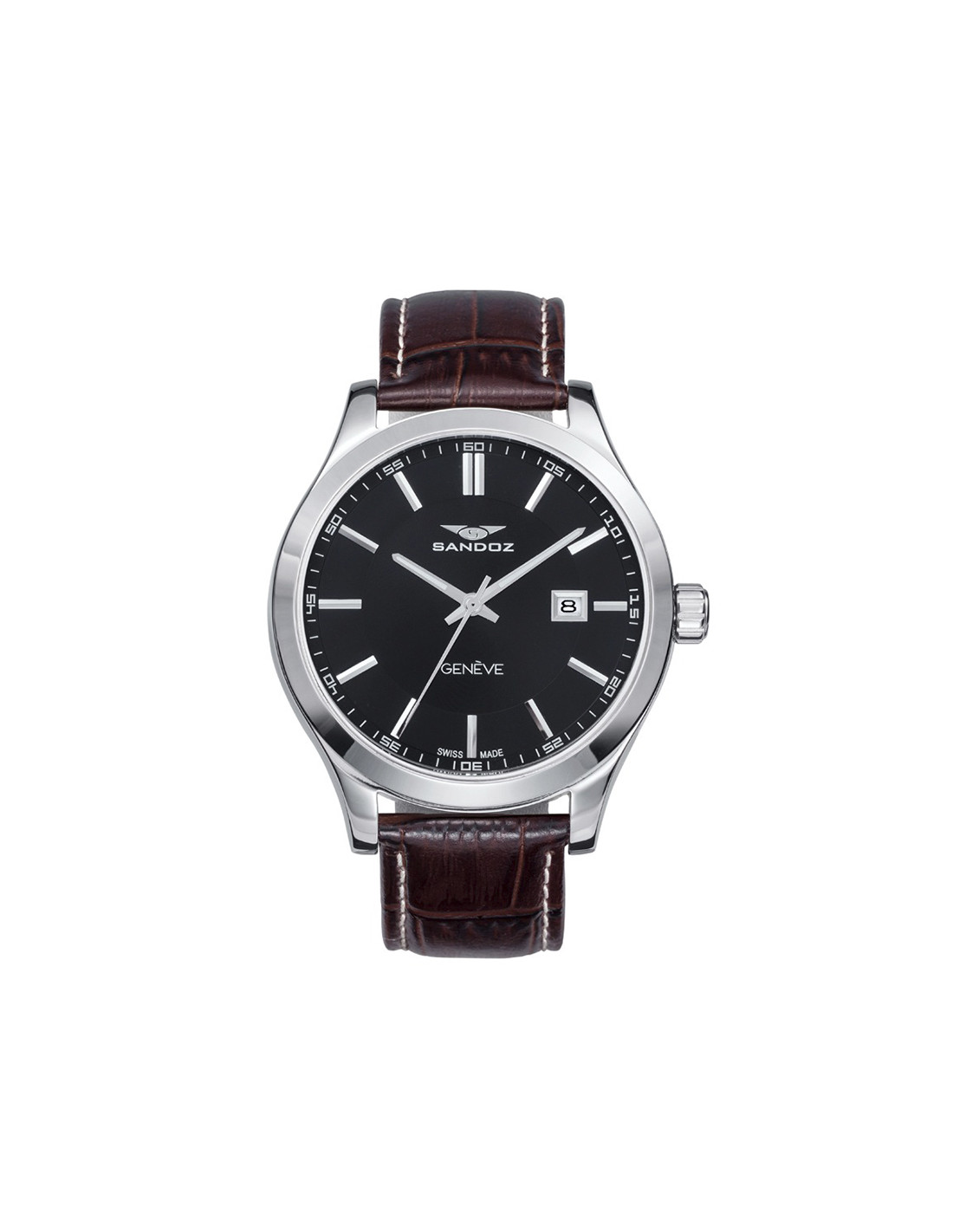 Reloj suizo para hombre fabricado en acero con correa de piel y cristal zafiro marca Sandoz colección Casuel. Se trata de un reloj suizo analógico con caja redonda de acero inoxidable. Esfera negra con calendario.