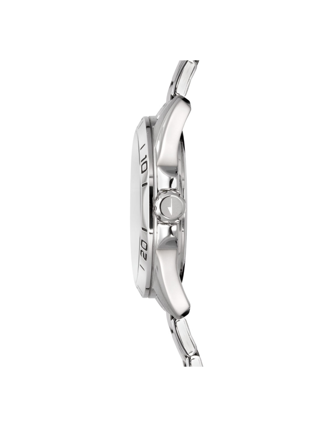 Fabricado en acero inoxidable con cristal mineral y pulsera de acero color plateado. Resistencia al agua 50 metros.
