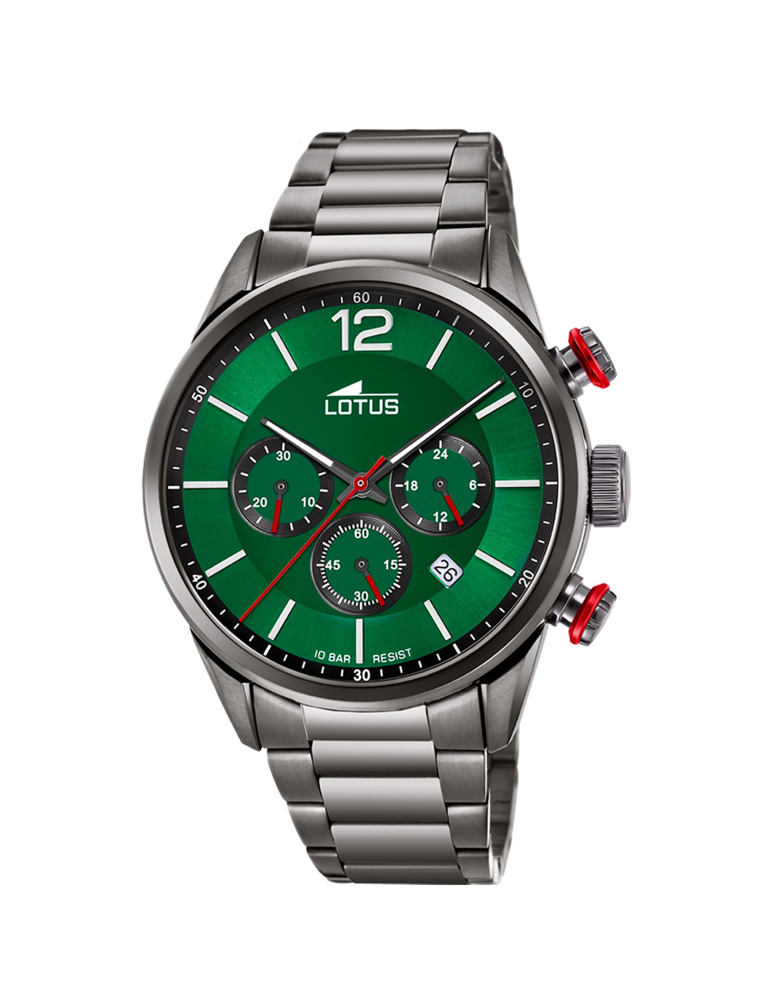 Reloj para hombre fabricado en acero marca Lotus colección Chrono. Esfera verde con calendario y movimiento cronógrafo.