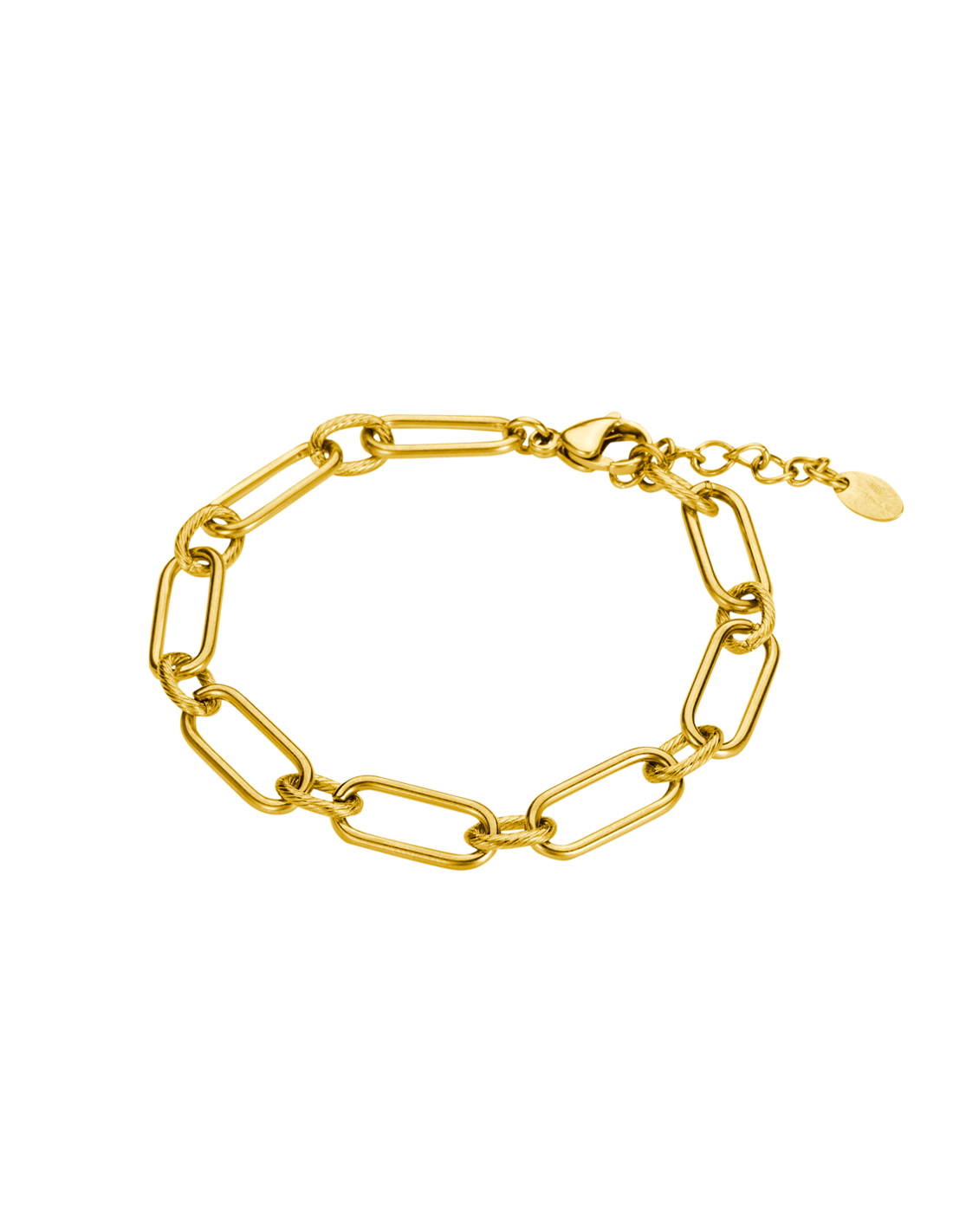 Fabricado en acero inoxidable con cristal mineral y pulsera de acero dorado. Resistencia al agua 50 metros.