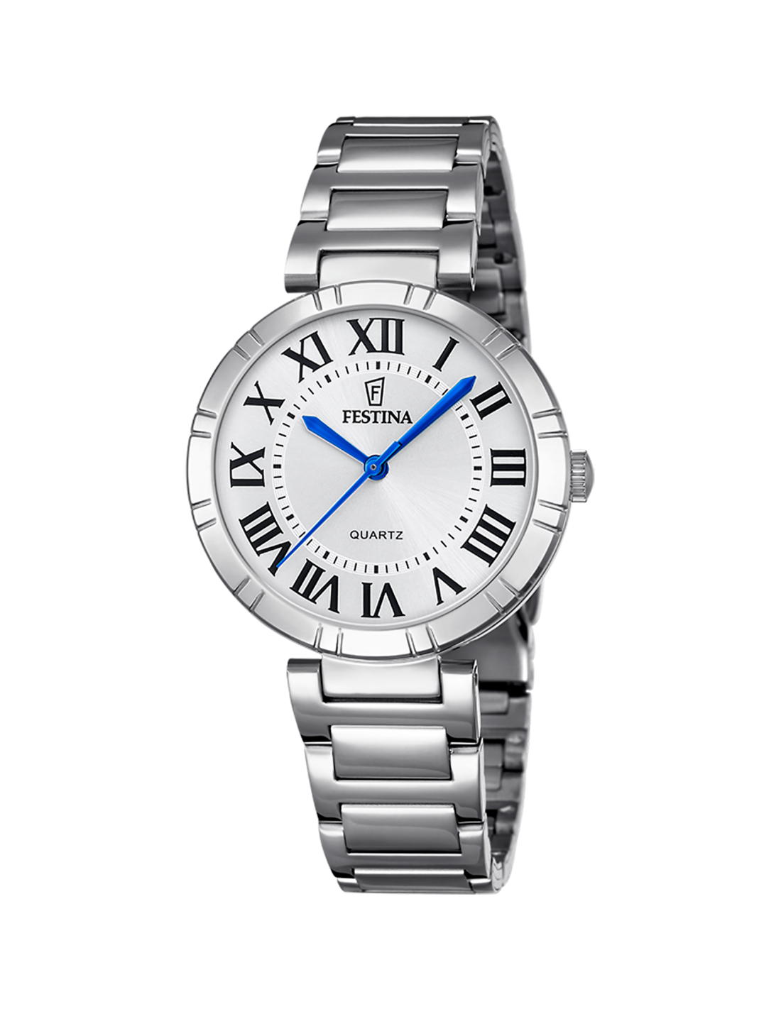 Reloj para mujer fabricado en acero marca Festina colección Mademoiselle. Se trata de un reloj analógico con caja redonda de acero inoxidable con esfera plateada con números romanos y agujas azules.
