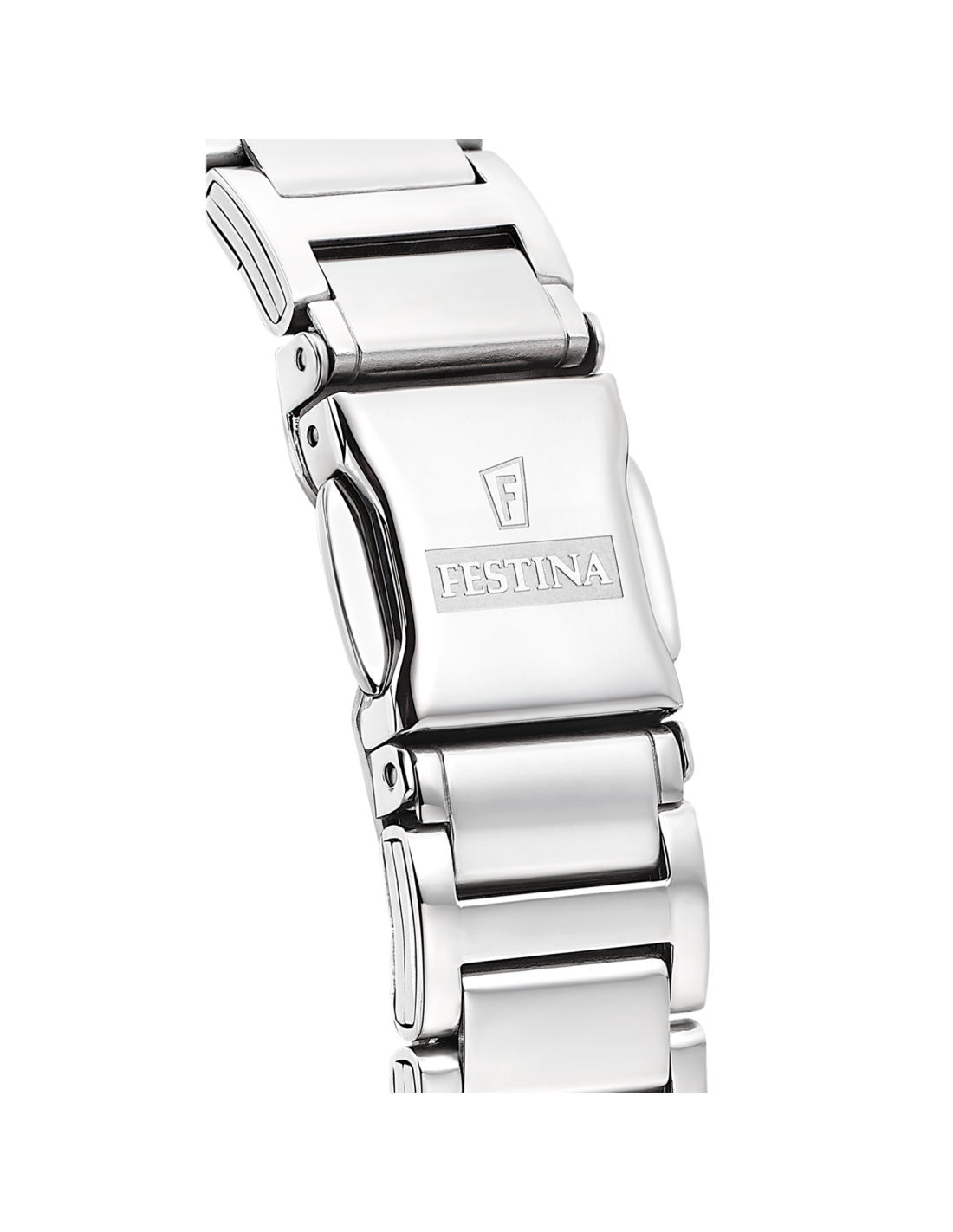 La caja del reloj tiene un diámetro de 32mm aproximadamente. Cristal mineral y movimiento de cuarzo. Pulsera de acero color plateado con cierre tipo desplegable. Tiene una resistencia al agua de 50 metros (5ATM). Cuenta con la garantía oficial Festina de 24 meses. Se entrega con su caja oficial.