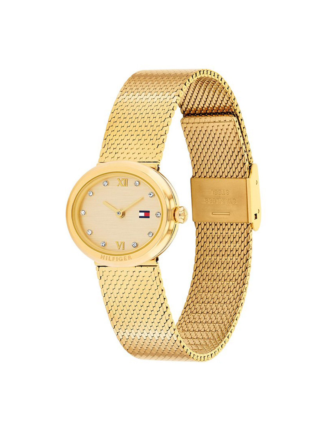 Se trata de un reloj analógico con caja ovalada de acero inoxidable color dorado. La caja del reloj tiene un ancho de 25mm aproximadamente. Cristal mineral y movimiento de cuarzo. Pulsera de malla de acero con cierre tipo broche. Tiene una resistencia al agua de 30m (3ATM). Cuenta con la garantía oficial Tommy Hilfiger de 24 meses. Se entrega con su caja oficial.
