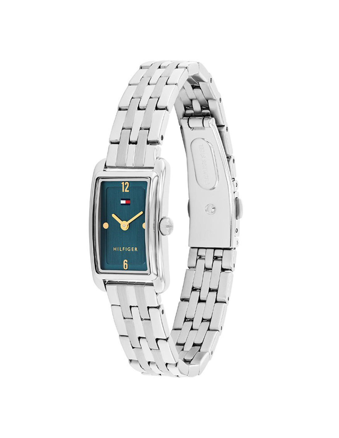 Se trata de un reloj analógico con caja rectangular de acero inoxidable color plateado. La caja del reloj tiene un ancho de 11mm aproximadamente. Cristal mineral y movimiento de cuarzo. Pulsera de eslabones de acero con cierre tipo broche. Tiene una resistencia al agua de 30m (3ATM). Cuenta con la garantía oficial Tommy Hilfiger de 24 meses. Se entrega con su caja oficial.