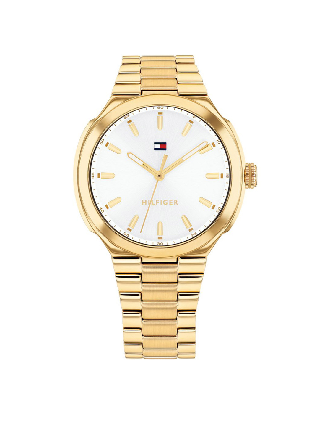 Reloj para mujer fabricado en acero marca Tommy Hilfiger colección Georgia. Con esfera color blanco y pulsera de eslabones de acero ip dorado.