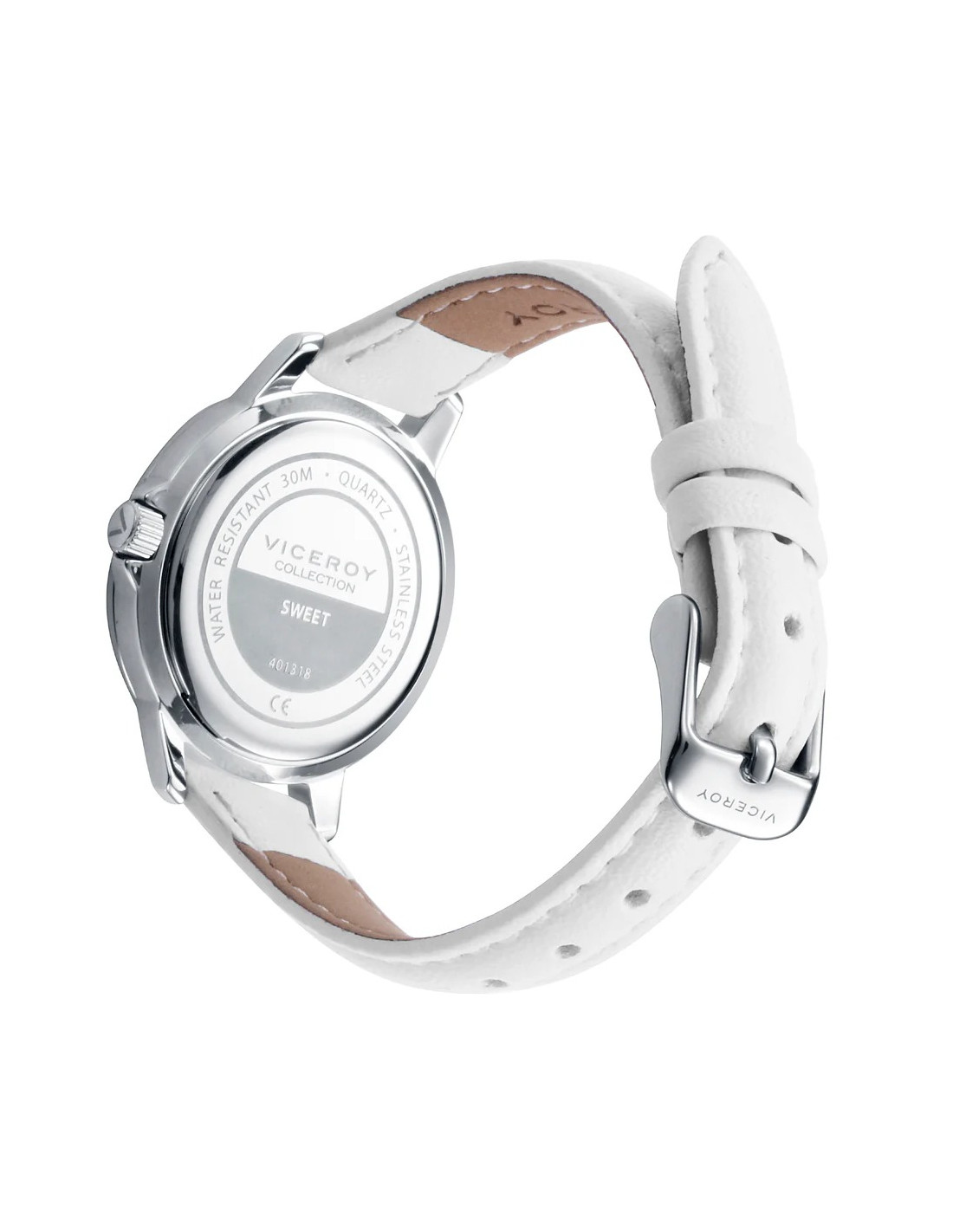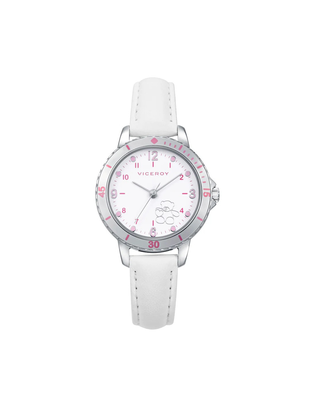 Se trata de un reloj analógico con caja redonda de acero inoxidable color plateado. La caja del reloj tiene un diámetro de 28mm. Cristal mineral y movimiento de cuarzo. Esfera blanca con osito. Correa blanca con cierre tipo hebilla. Tiene una resistencia al agua de 30 metros (3ATM). Cuenta con la garantía oficial Viceroy de 24 meses. Se entrega con su caja oficial.