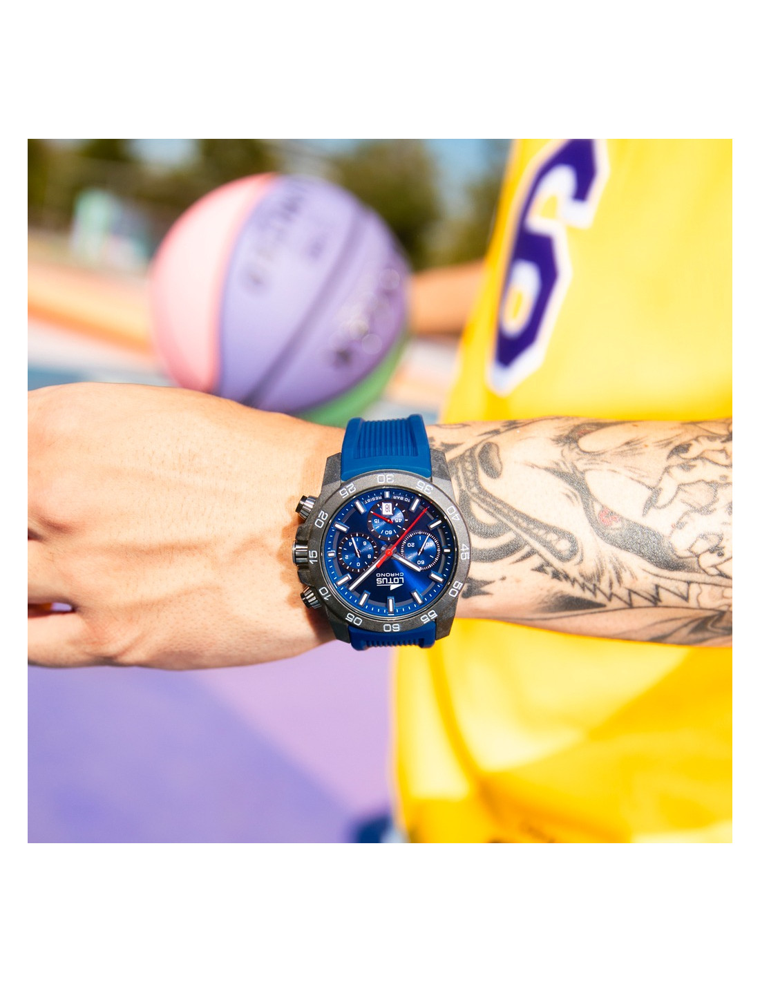 Reloj para hombre fabricado en fibra de carbono marca Lotus colección Chrono. Se trata de un reloj analógico con caja redonda de fibra de carbono y esfera azul con calendario.