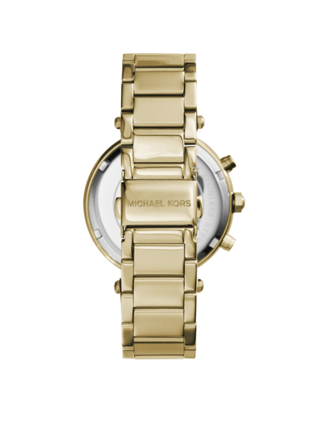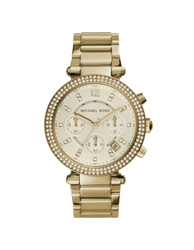 Reloj para mujer fabricado en acero marca Michael Kors modelo Parker. Con esfera color dorado y pulsera de eslabones de acero ip dorado.